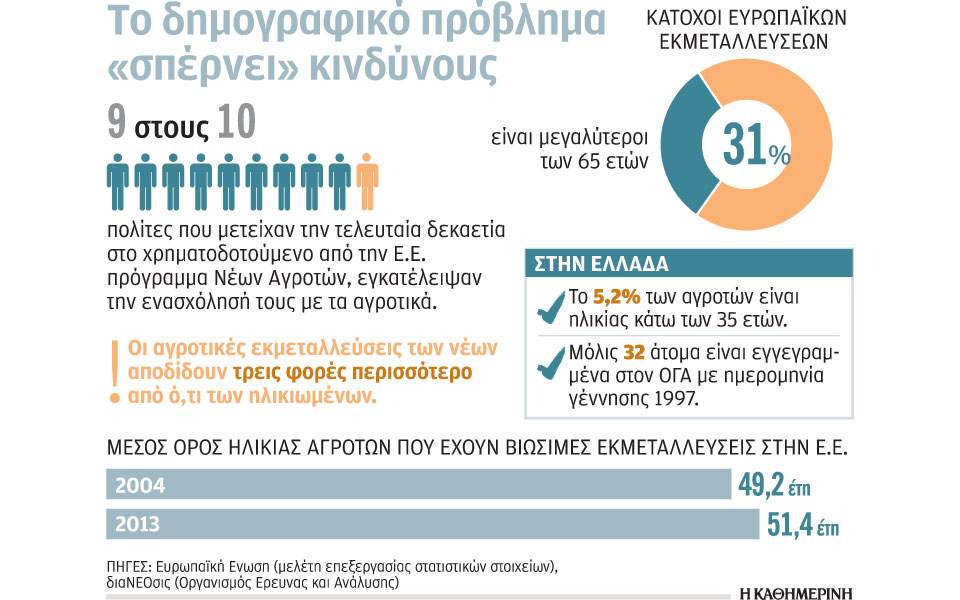 Ο αγροτικός πληθυσμός της Ε.Ε. γερνάει ολοένα και περισσότερο και οι μεγαλύτεροι δεν δείχνουν καμία διάθεση να κάνουν χώρο στους νεότερους, παρόλο που έχουν πριμοδοτηθεί γι’ αυτό από τα προγράμματα πρόωρης συνταξιοδότησης της Ε.Ε. Ενα από τα μεγαλύτερα προβλήματα είναι ότι οι ηλικιωμένοι αγρότες «κρατούν» τη γη στην ιδιοκτησία τους, με αποτέλεσμα τα εύφορα εδάφη στα κράτη-μέλη να τα διαχειρίζονται μεγαλύτεροι σε ηλικία αγρότες, οι οποίοι σπάνια επιτρέπουν στους νεότερους να αναλάβουν πρωτοβουλίες. Περίπου 3,2 εκατ. αγρότες στην Ε.Ε. είναι άνω των 65 ετών. Αν αυτοί εγκατέλειπαν το επάγγελμα, αναφέρει η σχετική μελέτη της Ε.Ε., θα απελευθερώνονταν 200 εκατ. στρέμματα αγροτικής γης, αρκετή έκταση για 1,2 εκατ. νέους αγρότες μεσαίου μεγέθους. Με άλλα λόγια, σε κάθε έναν νέο αγρότη αντιστοιχούν 2,5 ηλικιωμένοι αγρότες που πρέπει να σταματήσουν τη δραστηριότητα.