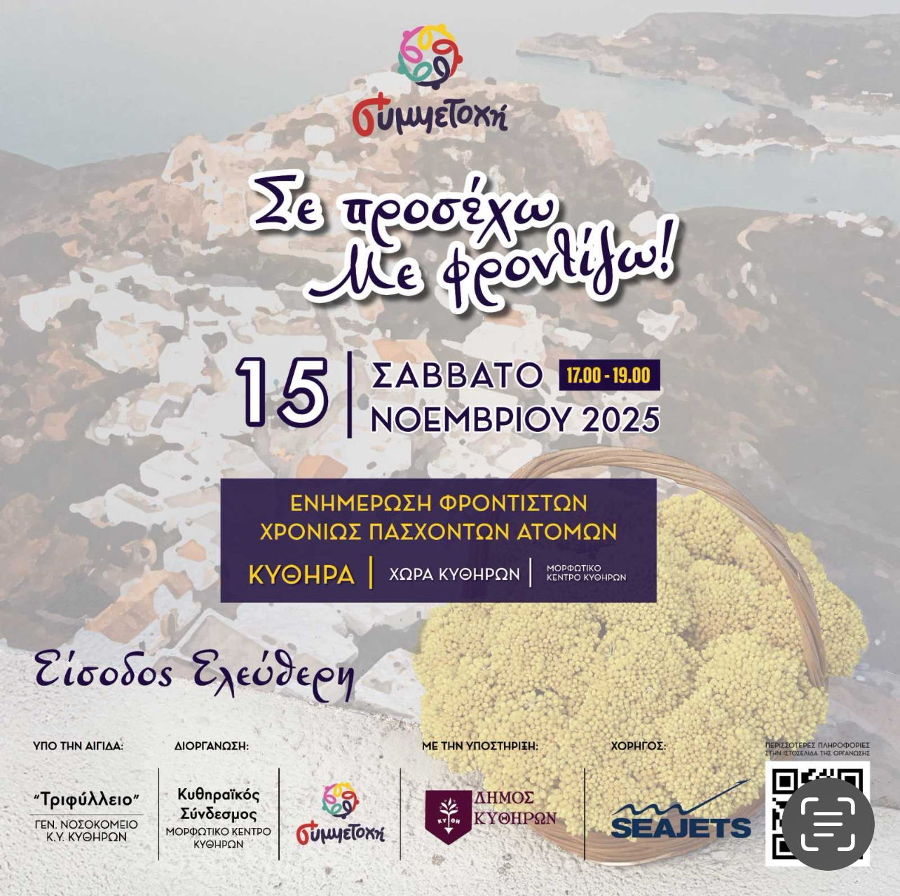 Σε αυτό το πλαίσιο, η ΑΜΚΕ Συμμετοχή και Μέθεξις, σε συνεργασία με τον Κυθηραϊκό Σύνδεσμο – Μορφωτικό Κέντρο Κυθήρων, διοργανώνει το Σάββατο 15Νοεμβρίου 2025 και ώρα 17:00, στοΜορφωτικό Κέντρο Κυθήρων, ενημερωτική εκδήλωση με τίτλο: