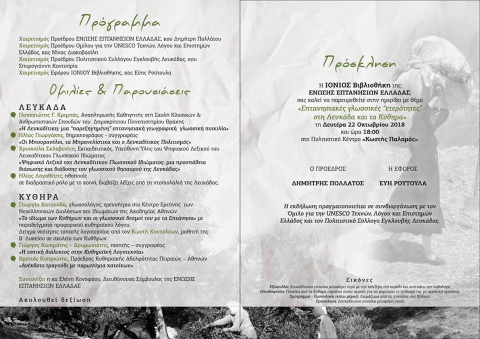 Μια εξαιρετική ημερίδα, με θέμα “Επτανησιακές γλωσσικές ετερότητες στη Λευκάδα και στα Κύθηρα» οργανώθηκε από την Ιόνιο Βιβλιοθήκη της Ένωσης Επτανησίων Ελλάδας στις 22 Οκτωβρίου. Η ημερίδα διεξήχθη στην αίθουσα Κωστής Παλαμάς, στο Πολιτιστικό Κέντρο του Εθνικού και Καποδιστριακού Πανεπιστημίου Αθηνών, με πολλή επιτυχία και με μεγάλη προσέλευση κόσμου από όλα τα Επτάνησα. Στην εκδήλωση συνδιοργανωτές ήταν ο Όμιλος UNESCO Τεχνών, Λόγου και Επιστημών Ελλάδας και ο Πολιτιστικός Σύλλογος Εγκλουβής Λευκάδας, ήταν δε υπό την αιγίδα του Δήμου Λευκάδας. Από πλευράς Κυθήρων, η σημαντική αυτή εκδήλωση για το νησί μας, είναι την ευγενή χορηγία από το Τριφύλλειο Ίδρυμα και από την Εταιρεία Κυθηραϊκών μελετών, καθώς επίσης την ενεργό συμμετοχή στην παρουσίαση μελών της Κυθηραϊκής Αδελφότητας Πειραιά –Αθήνας.