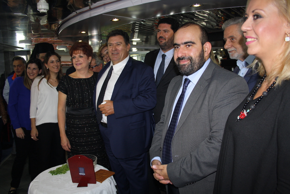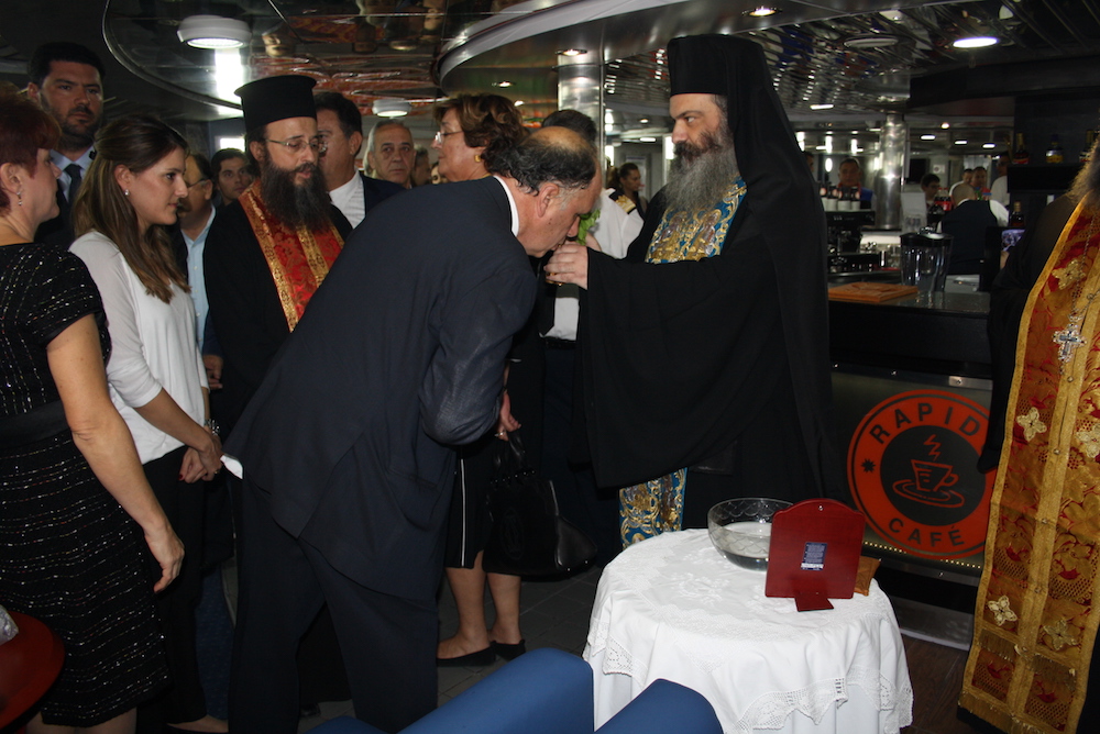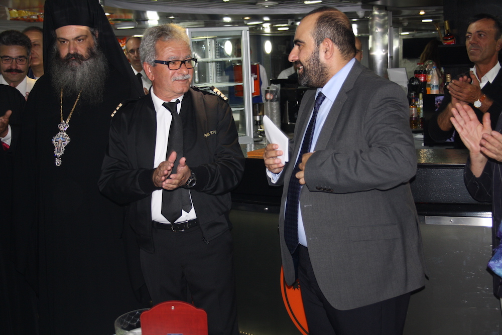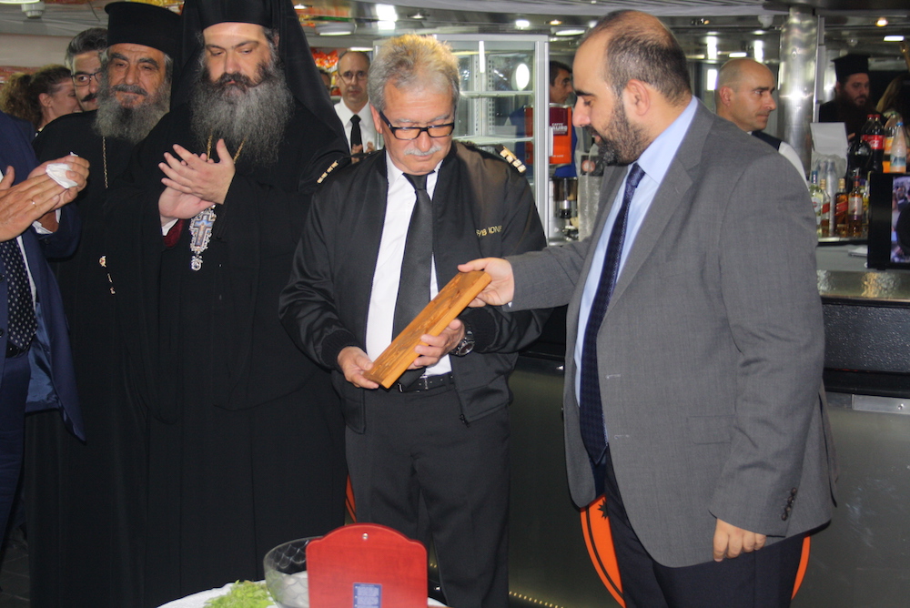 Επίσης, παρέδωσε εικόνα του προστάτη των ναυτικών Αγίου Νικολάου στον εορτάζοντα πλοίαρχο του σκάφους κ. Δημ. Λαδά, στον οποίο επίσης ευχήθηκε να κάνει πάντα καλά ταξίδια με το νέο πλοίο των γραμμών μας.