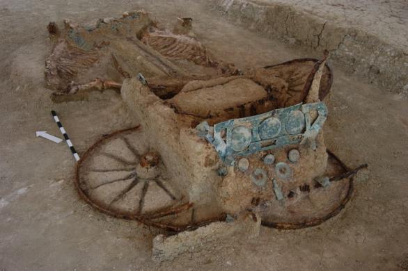 Οι πέντε άμαξες αποτελούν το πιο εντυπωσιακό εύρημα της ανασκαφής. Μαζί με τα υποζύγιά τους έχουν εναποτεθεί σε ρηχούς λάκκους, ανοιγμένους στο φυσικό έδαφος. Κάθε μια είναι λίγο διαφορετική από τις άλλες τόσο στη διακόσμηση όσο και στα τεχνικά χαρακτηριστικά. Σε όλες διατηρούνται οι άξονες, τα σιδερένια στεφάνια των τροχών (επίσωτρα), τα συμπαγή σιδερένια περιαξόνια καθώς και τα υπόλοιπα λειτουργικά και διακοσμητικά στοιχεία. Σε δύο από αυτές διατηρούνται ίχνη και αποτυπώματα των ξύλων.
