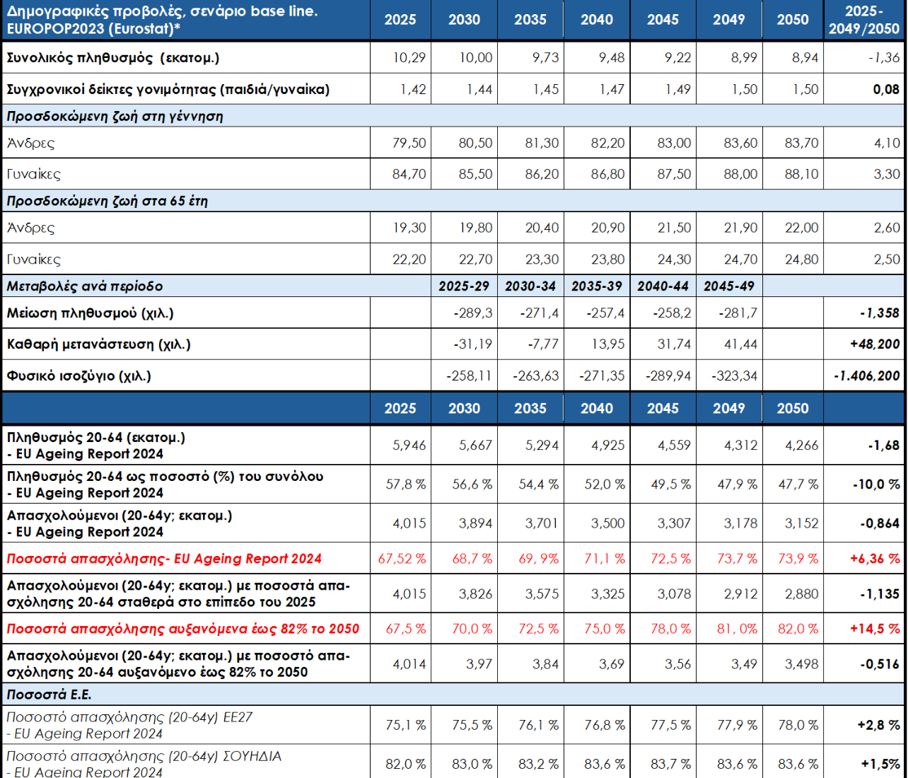 Φυσικά, ακόμη και αν επιτευχθεί ο στόχος αυτός αναφέρει, η σημερινή αναλογία απασχολούμενοι προς άτομα 65 ετών και άνω (164 απασχολούμενοι ανά 100 ηλικιωμένους σήμερα) θα μεταβληθεί καθώς το 2050 θα αντιστοιχούν μόλις 124. Η επί το δυσμενέστερο αυτή μεταβολή, σημειώνει, εν απουσία άλλων αλλαγών, θα έχει πολλαπλές επιπτώσεις και επιτάσσει σειρά παρεμβάσεων σε πλήθος πεδίων, στοχεύοντας όχι μόνον την άμβλυνση αλλά και την αναίρεση των αρνητικών επιπτώσεων των δημογραφικών μας εξελίξεων.
