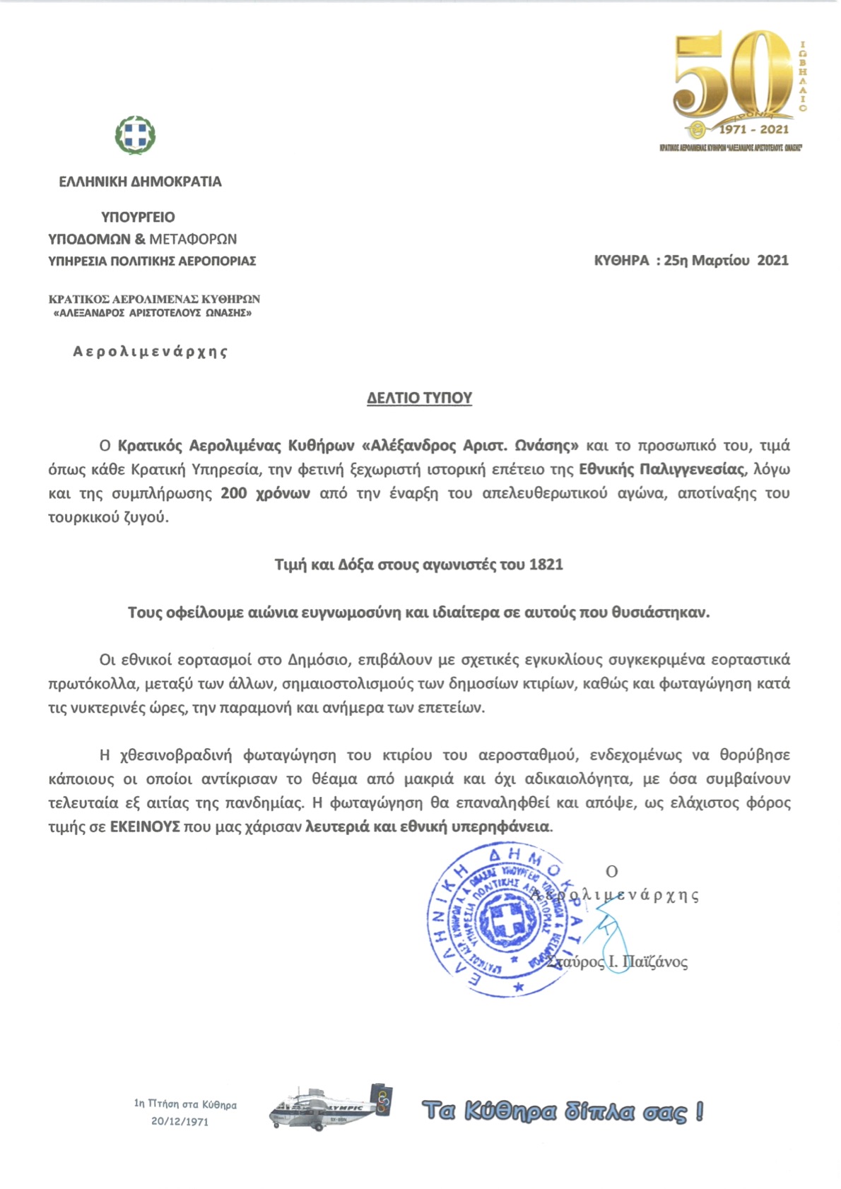 ΚΑΚΘ / ΑΕΡΟΛΙΜΕΝΑΡΧΗΣ: ΧΡΟΝΙΑ ΠΟΛΛΑ ΓΙΑ ΤΗΝ ΕΘΝΙΚΗ ΕΠΕΤΕΙΟ & ΤΟΝ ΕΥΑΓΓΕΛΙΣΜΟ ΤΗΣ ΘΕΟΤΟΚΟΥ