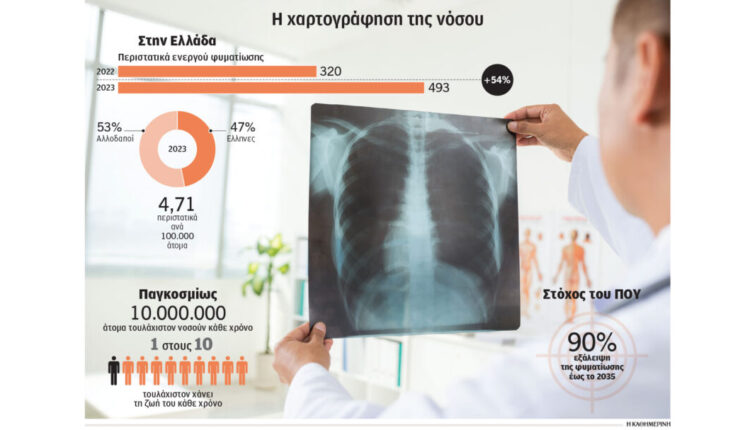 Σημαντική αύξηση των περιστατικών φυματίωσης καταγράφηκαν στην Ελλάδα το 2023 σε σύγκριση με το 2022. Ειδικότερα, το 2023 καταγράφηκαν στη χώρα μας συνολικά 493 περιστατικά ενεργού φυματίωσης, δηλαδή 54% περισσότερα σε σύγκριση με το 2022 (320 περιστατικά), γεγονός που, σύμφωνα με τον ΕΟΔΥ, «ακολουθεί» την παρατηρούμενη αύξηση των κρουσμάτων φυματίωσης παγκοσμίως μετά την αποδρομή της πανδημίας COVID-19. Με βάση τον αριθμό των δηλωμένων κρουσμάτων, η συχνότητα δήλωσης της νόσου στην Ελλάδα για το 2023 υπολογίζεται σε 4,71 περιστατικά ανά 100.000 πληθυσμού, που είναι η υψηλότερη αναλογία από το 2014 και μετά. Το 2023, το 47% των συνολικών κρουσμάτων ήταν Ελληνες και το 53% αλλοδαποί.