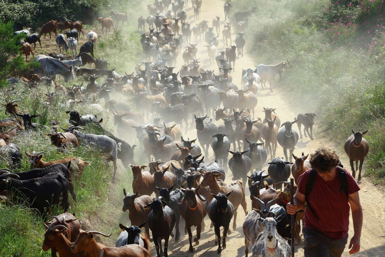 Μέσα σε μια συμφωνία από κουδουνίσματα, περίπου 300 μαύρες, καφέ και πιτσιλωτές κατσίκες τρέχουν κατά μήκος ενός ασφαλτοστρωμένου δρόμου στη βόρεια Καταλονία της Ισπανίας, σταματώντας πού και πού για να μασουλήσουν με όρεξη τα ξερά φυτά που βρίσκονται στις άκρες του δάσους.