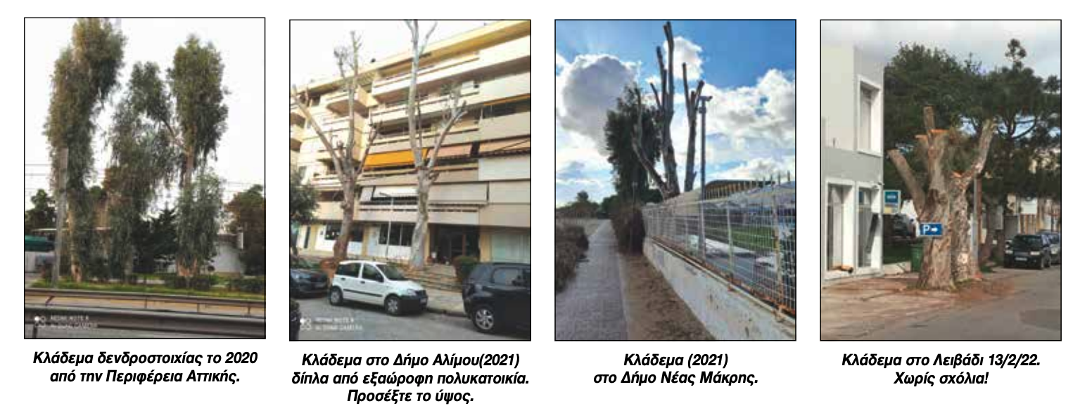 Στο Λειβάδι όμως δεν έγινε απλό κλάδεμα. Ευτυχώς, που δεν είχαμε κόψιμο κάτω από την πρώτη διακλάδωση οπότε μετά θα μιλούσαμε ότι έφτιαξαν ένα …κάθισμα και όχι κλάδεμα! Μιλήσαμε με το Δήμο και μας είπαν ότι ρώτησαν ειδικό. Δεν αμφιβάλλουμε, απλά θέλαμε να ξέρουμε αν ο ειδικός έδωσε οδηγία για κοπή σε αυτό το ύψος. Πριν μερικά χρόνια, είχαν κλαδέψει πάλι άλλους ευκαλύπτους στο Λειβάδι και αυτοί είχαν κοπεί σε μεγαλύτερο ύψος. Και για να μην νομίζετε ότι έχουμε παραγίνει ευαίσθητοι σας λέμε ότι έχουμε πλήθος από φωτογραφίες από κλαδέματα που έγιναν πάλι από ειδικούς σε διαφόρους Δήμους της Αθήνας. Παραθέτουμε μερικές για να δείτε σε ποίο ύψος κλάδεψαν τα δέντρα εκεί, που έχουν βέβαια ολόκληρες υπηρεσίες για τις δουλειές αυτές. Για να συγκρίνετε το ύψος της «περιτομής» που έκαναν στο Λειβάδι. Έτσι, απλά για να διαπιστώσετε για τι μιλάμε. Γιατί σε λίγο καιρό, μάλλον δεν θα υπάρχει ανάγκη να κλαδεύουν τα δέντρα. Γιατί, απλά, δεν θα έχει μείνει τίποτα!