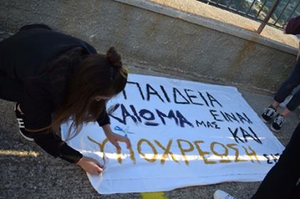 Τέλος, θέλουμε με την κίνηση αυτή να τονίσουμε – σε όποιον αμφιβάλλει – πως ως μαθητές ενδιαφερόμαστε περισσότερο από τον καθένα για τα τεκταινόμενα στον χώρο της εκπαίδευσης. Πάνω απ’ όλα δεν ανεχόμαστε πλέον να ακούμε δικαιολογίες περί έλλειψης χρημάτων τη στιγμή που 2,4 δισ. δαπανήθηκαν για την άμυνα της χώρας. Αναρωτιόμαστε, εν τέλει, έχουμε πόλεμο ή ειρήνη; Γιατί, εφόσον θέλουμε να υποστηρίζουμε πως ζούμε σε ειρήνη, χρειάζεται να λαμβάνουμε και τη μόρφωση που αναλογεί σε ένα τέτοιο καθεστώς μια μόρφωση που δυστυχώς, όσο περνούν τα χρόνια, βλέπουμε να χάνει ολοένα και πιο πολύ το αληθινό της νόημα.”