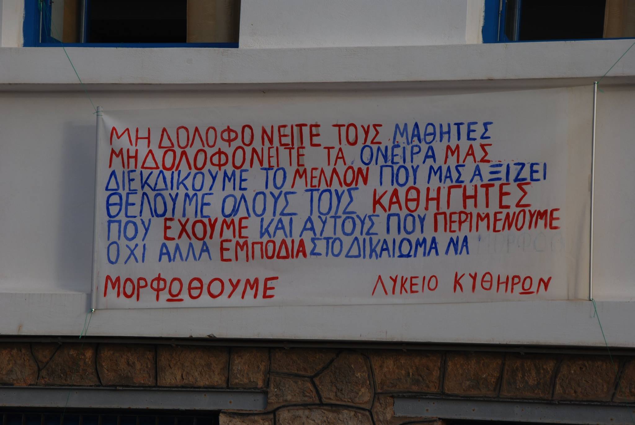 Εχθές κινητοποιήθηκαν και οι μαθητές του Λυκείου Κυθήρων, αντιδρώντας στις προαναγγελθείσες αλλαγές για τη διεξαγωγή των εξετάσεων στο Λύκειο, στις σοβαρές ελλείψεις καθηγητών, ακόμα και μαθημάτων κατεύθυνσης της τελευταίας τάξης του Λυκείου, ενώ συμμετέχουν και στην ευρύτερη πανελλαδική κινητοποίηση μαθητών.