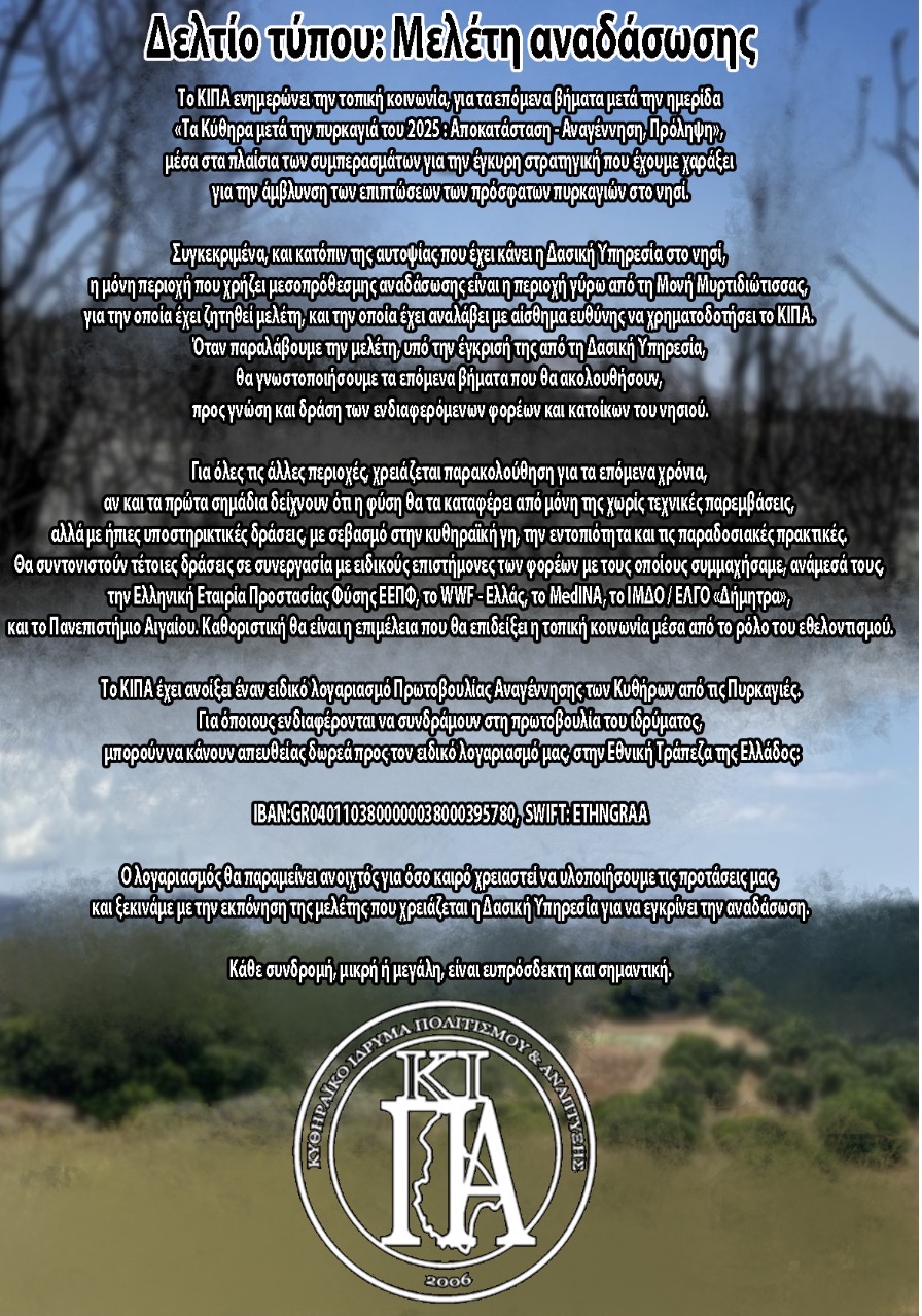 Tο ΚΙΠΑ ενημερώνει την τοπική κοινωνία, για τα επόμενα βήματα μετά την ημερίδα «Τα Κύθηρα μετά την πυρκαγιά του 2025 : Αποκατάσταση – Αναγέννηση, Πρόληψη», μέσα στα πλαίσια των συμπερασμάτων για την έγκυρη στρατηγική που έχουμε χαράξει για την άμβλυνση των επιπτώσεων των πρόσφατων πυρκαγιών στο νησί.