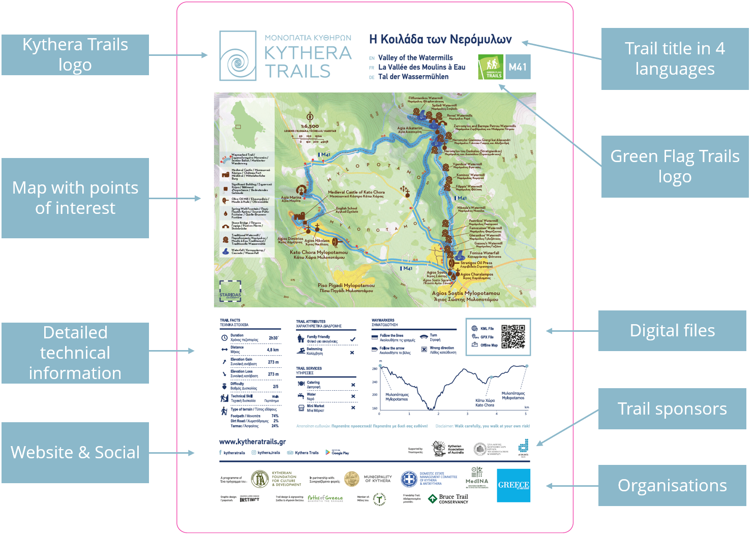 Οι πινακίδες χωρίζονται σε 4 μέρη. Στο πάνω μέρος βρίσκεται ο τίτλος και ο κωδικός της διαδρομής, με το σήμα ‘Green Flag Trails’, στις τρεις πιστοποιημένες διαδρομές του δικτύου. Στο κεντρικό τμήμα παρουσιάζεται ο χάρτης της διαδρομής, ο οποίος είναι προϊόν εξειδικευμένης χαρτογραφικής επιμέλειας. Ιδιαίτερο βάρος δόθηκε στις ονομασίες των σημείων ενδιαφέροντος, ακόμα και των λιγότερο γνωστών, όπως οι νερόμυλοι του Καραβά. Πιο κάτω, αναγράφονται τα βασικά στοιχεία των διαδρομών, όπως απόσταση και βαθμός δυσκολίας, τα οποία είναι πλήρως εναρμονισμένα με τα πρότυπα της πιστοποίησης Green Flag Trails. Επίσης, με τα QR codes οι χρήστες μπορούν να κατεβάσουν τα αρχεία των διαδρομών στο κινητό τους. Τέλος, στο κάτω μέρος, αναφέρονται οι εταίροι, οι συντελεστές και οι υποστηρικτές του προγράμματος, όπως και το σήμα του ΕΟΤ.