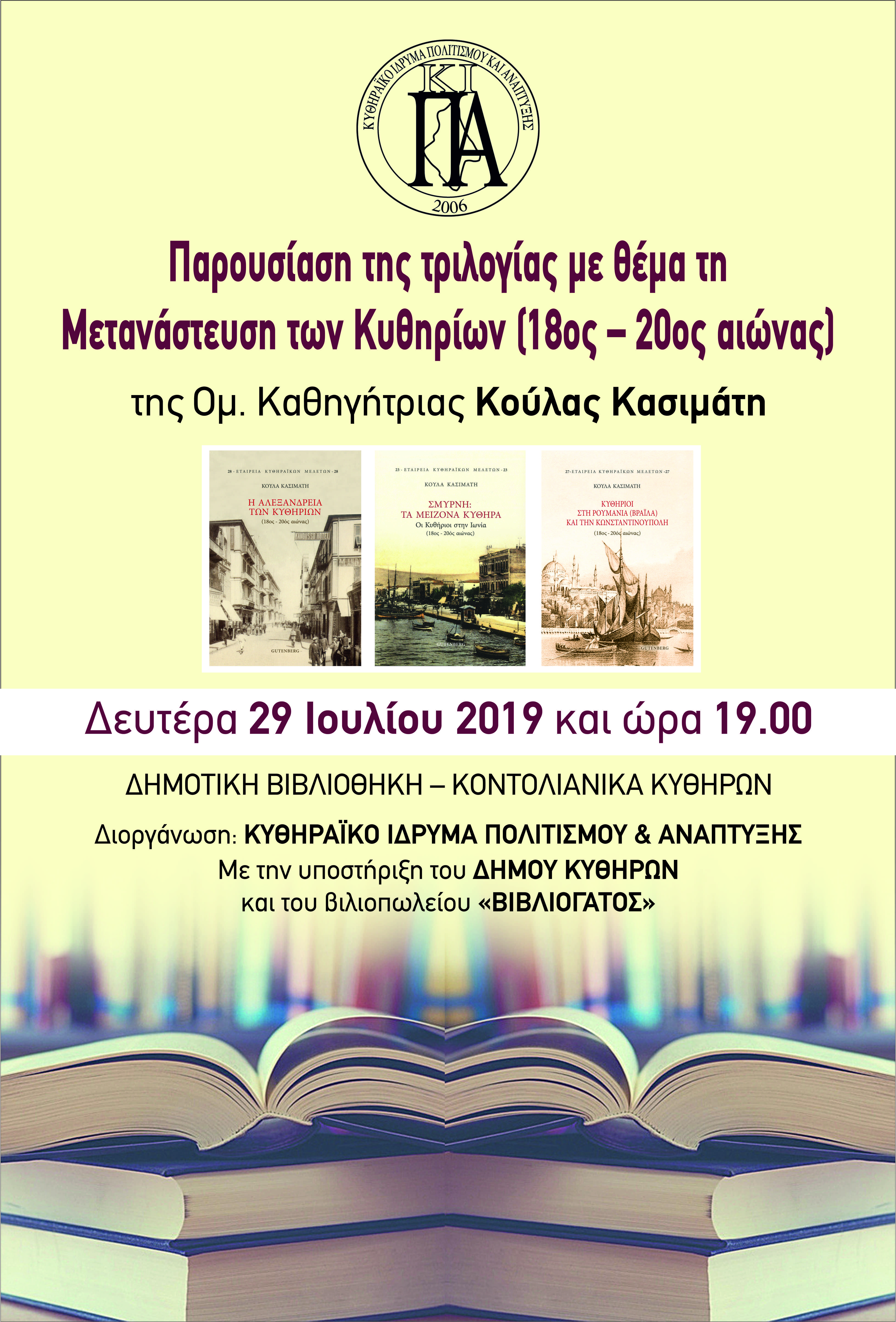 ΚΙΠΑ: Παρουσίαση της τριλογίας με θέμα τη μετανάστευση των Κυθηρίων της Ομ. Καθηγήτριας Κούλας Κασιμάτη
