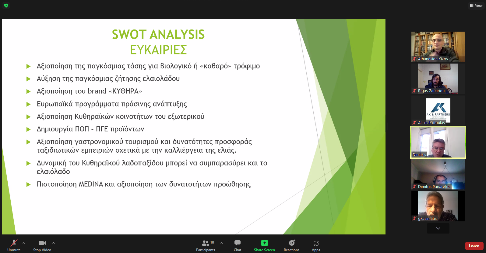 Οι Αλέξης Κωτούλας και Δημήτρης Τσιμπέρης, στελέχη της εταιρείας AK & Partners, με πολυετή εμπειρία στο χώρο του μάρκετινγκ αγροδιατροφικών προϊόντων, περιέγραψαν την υφιστάμενη κατάσταση του ελαιοκομικού κλάδου στα Κύθηρα, αναφέροντας τα δυνατά του σημεία, τις αδυναμίες, τις ευκαιρίες και τις απειλές (ανάλυση SWOT).