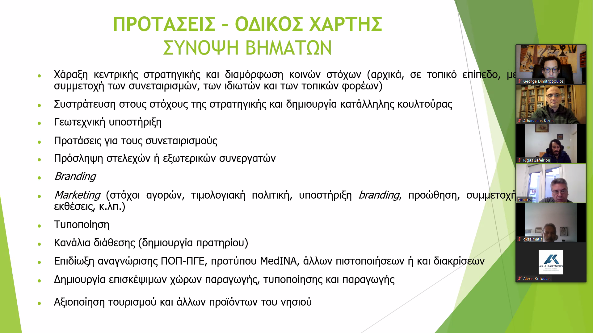Στην αρχή της συνάντησης, ο συντονιστής του προγράμματος, Ρήγας Ζαφειρίου, παρουσίασε την πρόοδο του προγράμματος και τη διαδικασία πιστοποίησης στα Κύθηρα, ενώ ο Γιώργος Δημητρόπουλος, συντονιστής του προγράμματος Terra Lemnia στη Λήμνο εκ μέρους του MedINA, παρουσίασε το σήμα ποιότητας προϊόντων Terra Vita, το οποίο θα συνοδεύει τα πιστοποιημένα προϊόντα όπως το ελαιόλαδο Κυθήρων των συνεργαζόμενων παραγωγών.