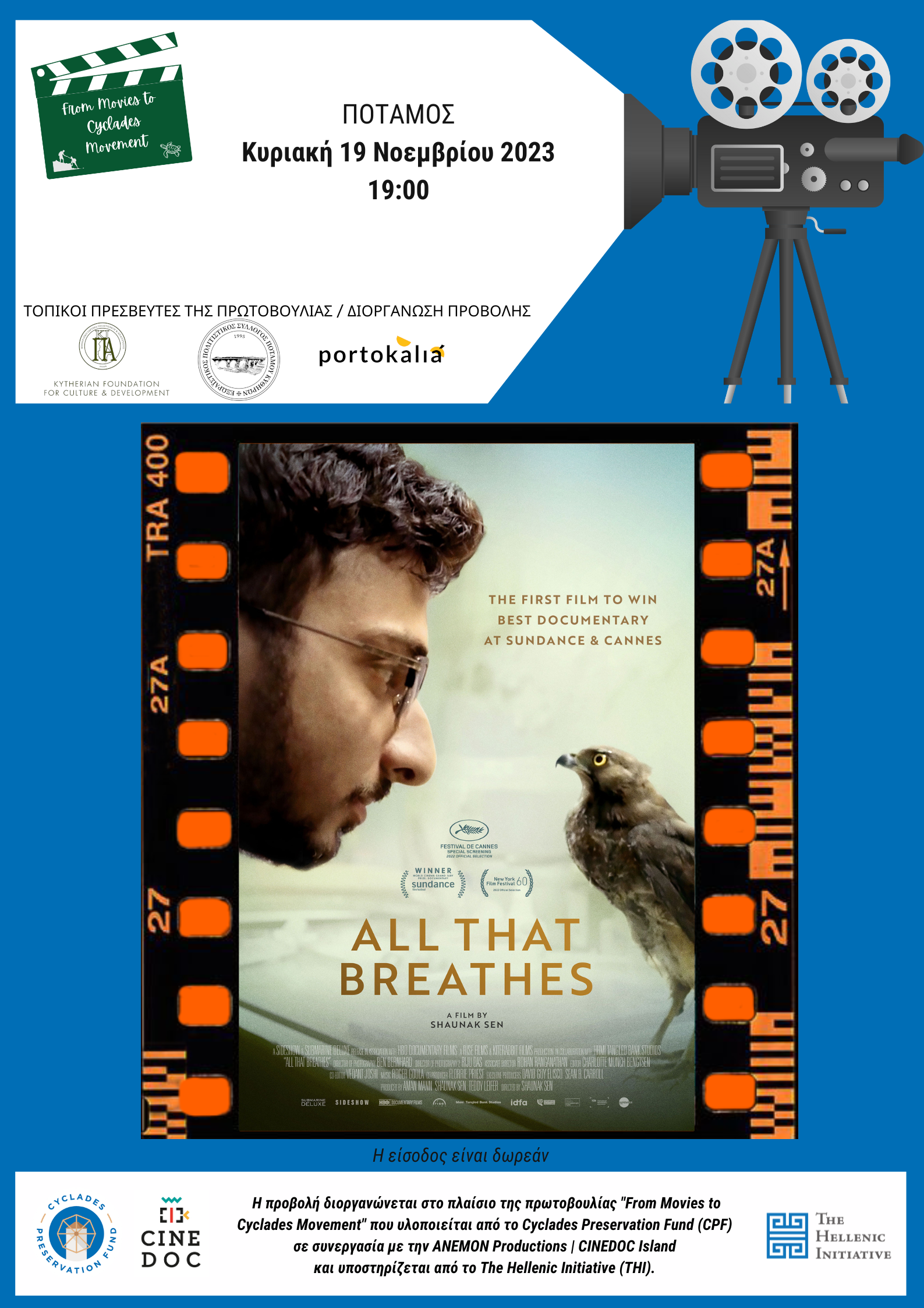 Το ΚΥΘΗΡΑΪΚΟ ΙΔΡΥΜΑ ΠΟΛΙΤΙΣΜΟΥ ΚΑΙ ΑΝΑΠΤΥΞΗΣ (Κ.Ι.Π.Α) σε συνεργασία με τον Σύλλογο «Πορτοκαλιά» και τον Εξωραϊστικό Πολιτιστικό Σύλλογο Ποταμού, σας προσκαλεί, μικρούς και μεγάλους, στη προβολή του πολυβραβευμένου ντοκιμαντέρ ALL THAT BREATHES, την Κυριακή 19 Νοεμβρίου, στις 7 το απόγευμα, στο Πνευματικό Κέντρο Ποταμού.