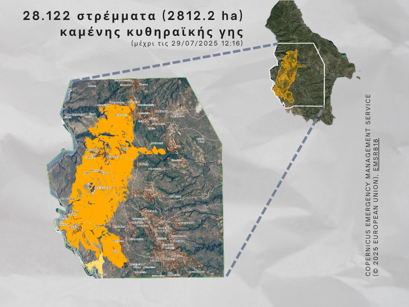 Ο εφιάλτης της μεγάλης πυρκαγιάς του 2017 ξαναχτύπησε τα Κύθηρα μόλις οκτώ καλοκαίρια μετά. Πάνω από 28.000 στρέμματα κυθηραϊκής γης κάηκαν, με διαρκείς αναζωπυρώσεις μέχρι και πρόσφατα (30 Ιουλίου) που ισοδυναμούν με περισσότερο από το 10% της έκτασης του νησιού. Σημαντικό μέρος της πληγείσας περιοχής ταυτίζεται με τις καμένες εκτάσεις του 2017 με αποτέλεσμα να αποδυναμωθεί η φυσική αναγέννηση και να υποβαθμιστούν οι εδαφικοί πόροι, εντείνοντας τη διάβρωση και τον κίνδυνο πλημμυρικώνφαινομένων. Στο βαθμό που επηρεάζεται και τμήμα του κεδροδάσους, το οποίο δεν αναγεννάται φυσικά μετά από πυρκαγιές, θα έχουμε επιπλέον μία σημαντική απώλεια για το φυσικό περιβάλλον του νησιού.