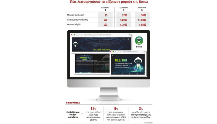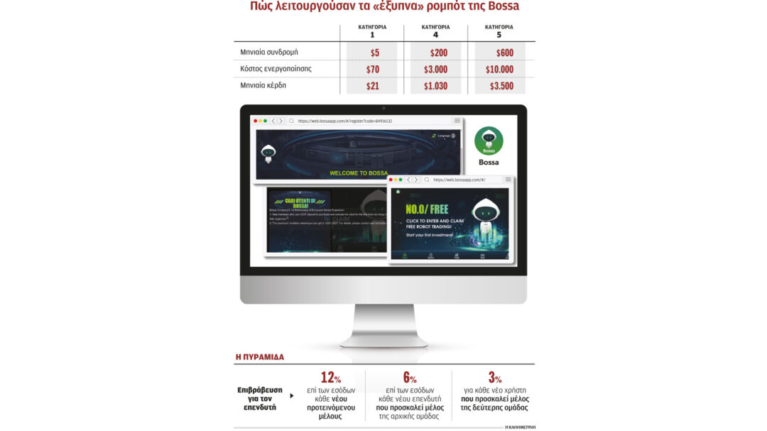 Οι χρήστες του app δεν χρειαζόταν να διαθέτουν ούτε καν στοιχειώδεις γνώσεις για τα κρυπτονομίσματα. Αρκούσε μόνο να έχουν χρήματα για να αγοράσουν κάποιο από τα ρομπότ που είχε, δήθεν, αναπτύξει η εταιρεία. Προγράμματα δηλαδή που βασίζονται σε τεχνητή νοημοσύνη, διαθέτουν… αλάνθαστη επενδυτική κρίση, αποφέροντας αποδόσεις που ξεκινούν από 30%. «Τα ρομπότ της Bossa υπερβαίνουν τις ανθρώπινες αδυναμίες, δεν πάσχουν από απληστία και φόβο, εφαρμόζοντας αυστηρή επενδυτική στρατηγική», σημείωναν οι εγκέφαλοι της οικονομικής αυτής απάτης που έχει ομοιότητες με την επενδυτική πυραμίδα της Wind Media που αποκαλύφθηκε μόλις πριν από δύο χρόνια.