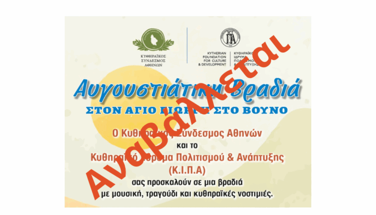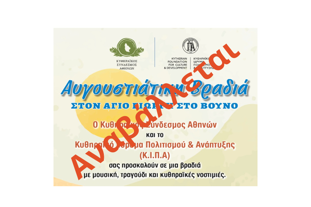 Σε ένδειξη συμπαράστασης και σεβασμού προς τις δύσκολες στιγμές ο Σύνδεσμος αποφάσισε την αναβολή της προγραμματισμένης, από κοινού με το Κυθηραϊκό Ίδρυμα Πολιτισμού και Ανάπτυξης, εκδήλωσης στις 3 Αυγούστου στον Άγιο Γιώργη στο Βουνό .
