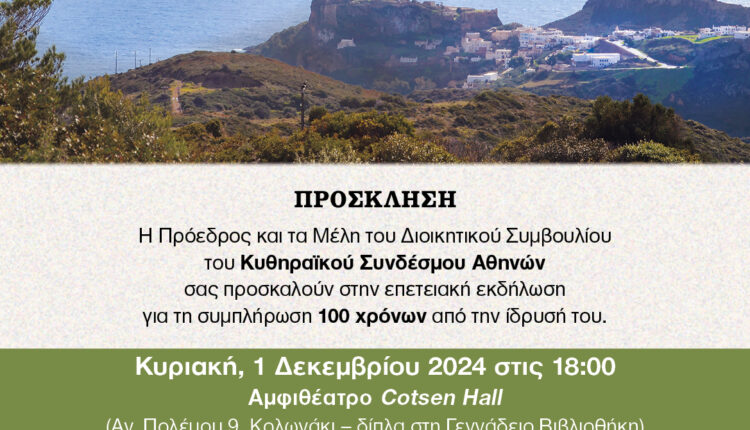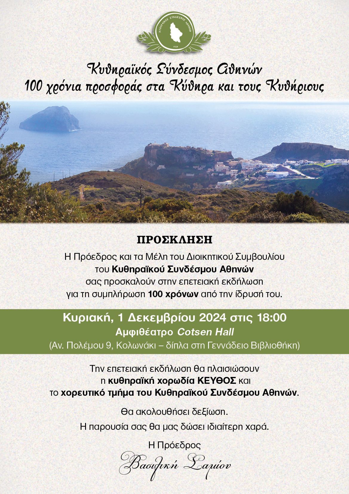 Ενημερώνουμε τα μέλη και τους φίλους του Κυθηραϊκού Συνδέσμου Αθηνών ότι μπορούν να παρακολουθήσουν την επετειακή εκδήλωση του Συνδέσμου μέσω ζωντανής αναμετάδοσης, ώστε να μοιραστούν μαζί μας αυτή τη σημαντική στιγμή.