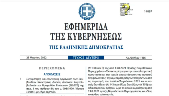 Δημοσιεύτηκε σε ΦΕΚ η κοινή απόφαση των Υπουργών Περιβάλλοντος και Ενέργειας, Οικονομικών, και Δικαιοσύνης με την οποία καθορίζονται τα θέματα της συγκρότησης και εσωτερικής οργάνωσης των Συμβουλίων Ιδιοκτησίας Δασών, Δασικών, Χορτολιβαδικών και Βραχωδών Εκτάσεων (ΣΙΔΒΧΕ)* των περιοχών που δεν ισχύει το τεκμήριο υπέρ του Δημοσίου (περιοχές του δευτέρου εδαφίου του άρθρου 62 του ν. 998/1979).