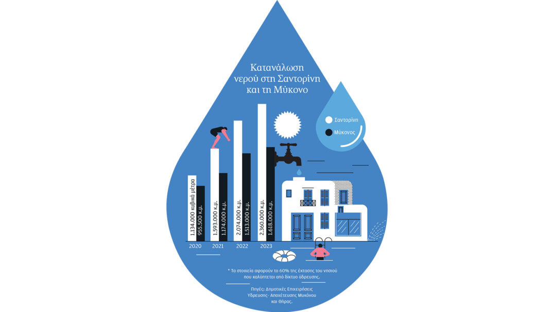 Η τεράστια αύξηση της κατανάλωσης αποτυπώνεται και στην έτερη «ναυαρχίδα» των Κυκλάδων, τη Μύκονο. Σύμφωνα με στοιχεία της ΔΕΥΑ Μυκόνου, η κατανάλωση το 2020 (χρονιά της καραντίνας) ήταν 955.505 κυβικά μέτρα νερού, το 2021 αυξήθηκε στο 1.174.254 κυβικά (+22,9%), το 2022 στο 1.513.068 κυβικά (+28,8%) για να φτάσει το 2023 στο 1.618.069 κυβικά (+7%). Με άλλα λόγια, αν θεωρήσουμε ότι το 2020 δεν ήταν μια συνηθισμένη χρονιά λόγω κορωνοϊού, η κατανάλωση νερού στη Μύκονο μέσα σε δύο χρόνια (από το 2021 έως το 2023) αυξήθηκε κατά 37,8%. «Επιπλέον, τα στοιχεία της ΔΕΥΑ δεν αποτυπώνουν την πλήρη εικόνα, καθώς το 40% του νησιού δεν καλύπτεται από το δίκτυο ύδρευσης. Η συνολική κατανάλωση του νησιού εκτιμώ ότι φθάνει στα 2,5-3 εκατ. κυβικά ετησίως», σημειώνει ο κ. Νόκας. «Οπως και σε πολλά νησιά, έτσι και στη Μύκονο ο καθένας χτίζει όπου θέλει και στη συνέχεια καλύπτει τις ανάγκες του είτε με ιδιωτικές γεωτρήσεις –που υπεραντλούνται, με αποτέλεσμα να έχουν κακής ποιότητας νερό– είτε με αγορά νερού. Oμως η αύξηση της κατανάλωσης επιβαρύνει και τις περιοχές που έχουν δίκτυα, καθώς αυτά δεν έχουν σχεδιαστεί σωστά. Στη Μύκονο, για παράδειγμα, το δίκτυο κατασκευάστηκε αρχικά για να καλύπτει μόνο τη Χώρα και τώρα υποστηρίζει όλες τις επεκτάσεις χωρίς αντίστοιχες προδιαγραφές. Αντίστοιχο θέμα έχει και ο βιολογικός καθαρισμός του νησιού, που έχει σχεδιαστεί για ισοδύναμο πληθυσμό 50.000 ανθρώπων και το καλοκαίρι εξυπηρετεί πάνω από 100.000. Ολα λειτουργούν στο όριο».