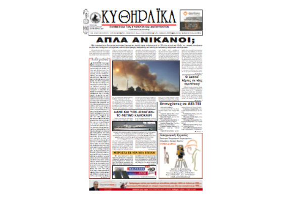 Μην παραλείψετε να πλοηγηθείτε στην πλήρως ανανεωμένη ιστοσελίδα της εφημερίδας μας στην ηλεκτρονική διεύθυνση: www.kythiraika.gr. Θα βρείτε μερικά ενδιαφέροντα θέματα από πρόσφατα φύλλα μας, ενώ σταδιακά η ύλη αυτή θα εμπλουτίζεται από το αρχειακό υλικό της εφημερίδας. Εννοείται ότι η χάρτινη έκδοση, η οποία εδώ και 30 χρόνια κρατάει συντροφιά στους Κυθηρίους και τους φίλους του νησιού όπου γης, που κυκλοφορεί σήμερα κανονικά, θα συνεχίσει την πορεία της.