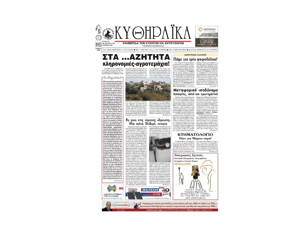 Κυκλοφόρησε το φύλλο Μαρτίου 2019 της εφημερίδας ΚΥΘΗΡΑΪΚΑ με τα εξής θέματα