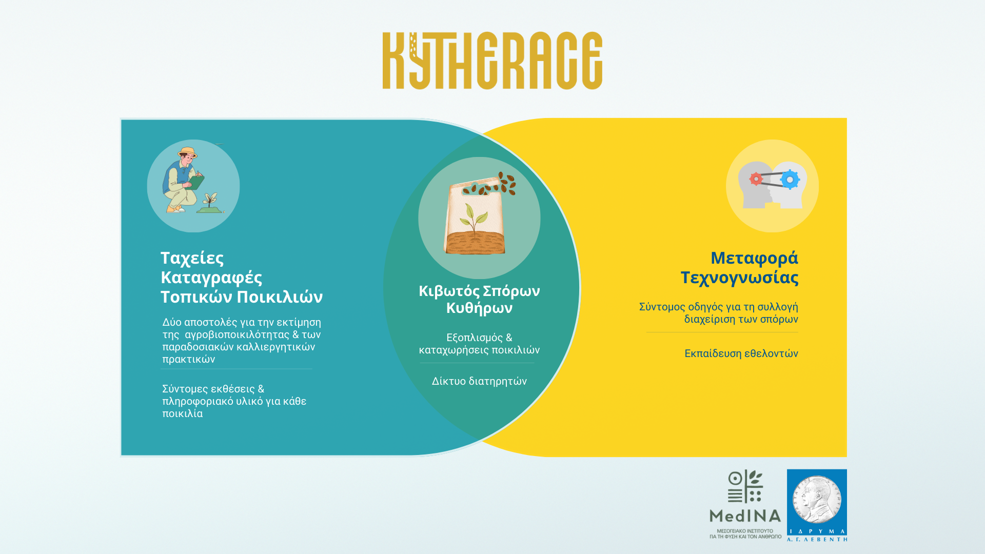 Μέσω του KYTHERACE, και βασιζόμενο στην εμπειρία προηγούμενων έργων, όπως το LEMRACE και το Terra Kytheria, το MedINA θα εργαστεί εντατικά στο νησί των Κυθήρων για τη θωράκιση της αγροτικής γενετικής κληρονομιάς του. Το έργο περιλαμβάνει δύο αποστολές καταγραφής, για να εντοπιστούν τόσο οι τοπικές ποικιλίες που διατηρούνται ακόμα σήμερα όσο και οι παραδοσιακές ή καινοτόμες μέθοδοι καλλιέργειάς τους. Επιπλέον, περιλαμβάνει τη συλλογή σπόρων και τη δημιουργία της «Κιβωτού Κυθηραϊκών Σπόρων», μιας μικρής κλίμακας κοινοτική τράπεζα σπόρων με τον απαραίτητο εξοπλισμό. Μέσω των ανωτέρω δράσεων θα ενισχυθεί η δικτύωση και συνεργασία με τοπικούς φορείς, αγρότες και συλλόγους, ώστε να δημιουργηθεί ένα ζωντανό δίκτυο διατηρητών των κυθηραϊκών ποικιλιών.