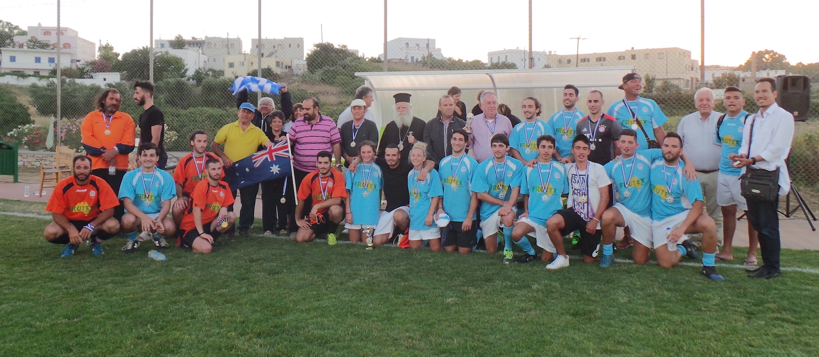 Εδώ η ομάδα των ομογενών μαζί με το χορηγό της κατασκευής του γηπέδου, ομογενή επιχειρηματία κ. Παν. Μάγειρο, το Μητροπολίτη, το Δήμαρχο και θεατές.