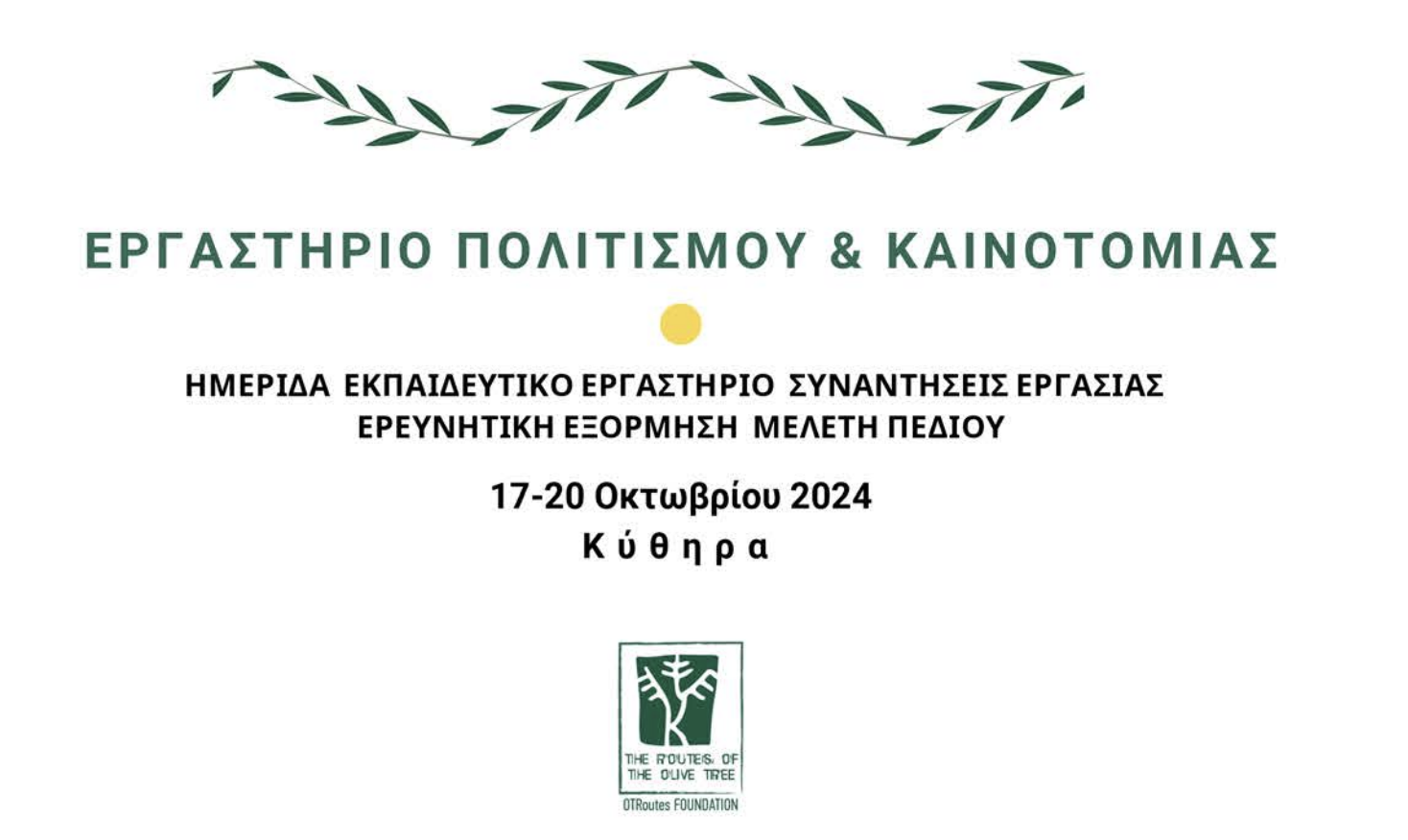ΕΡΓΑΣΤΗΡΙΟ ΠΟΛΙΤΙΣΜΟΥ & ΚΑΙΝΟΤΟΜΙΑΣ Σάββατο, 19 Οκτωβρίου 2024 Συνεδριακό Κέντρο (δημοτικό σχολείο) Φρατσίων Κυθήρων