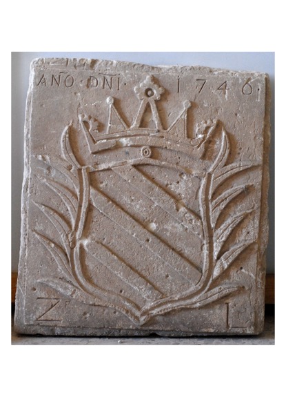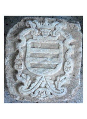 Πλάκα οικοσήμου που δεν σώζεται ακέραιη και αποδίδεται σε κλάδο της οικογενείας Βενιέρ. Διακρίνεται λέοντας που κρατάει βιβλίο και αποτελεί παραλλαγή γνωστού οικοσήμου της οικογενείας.