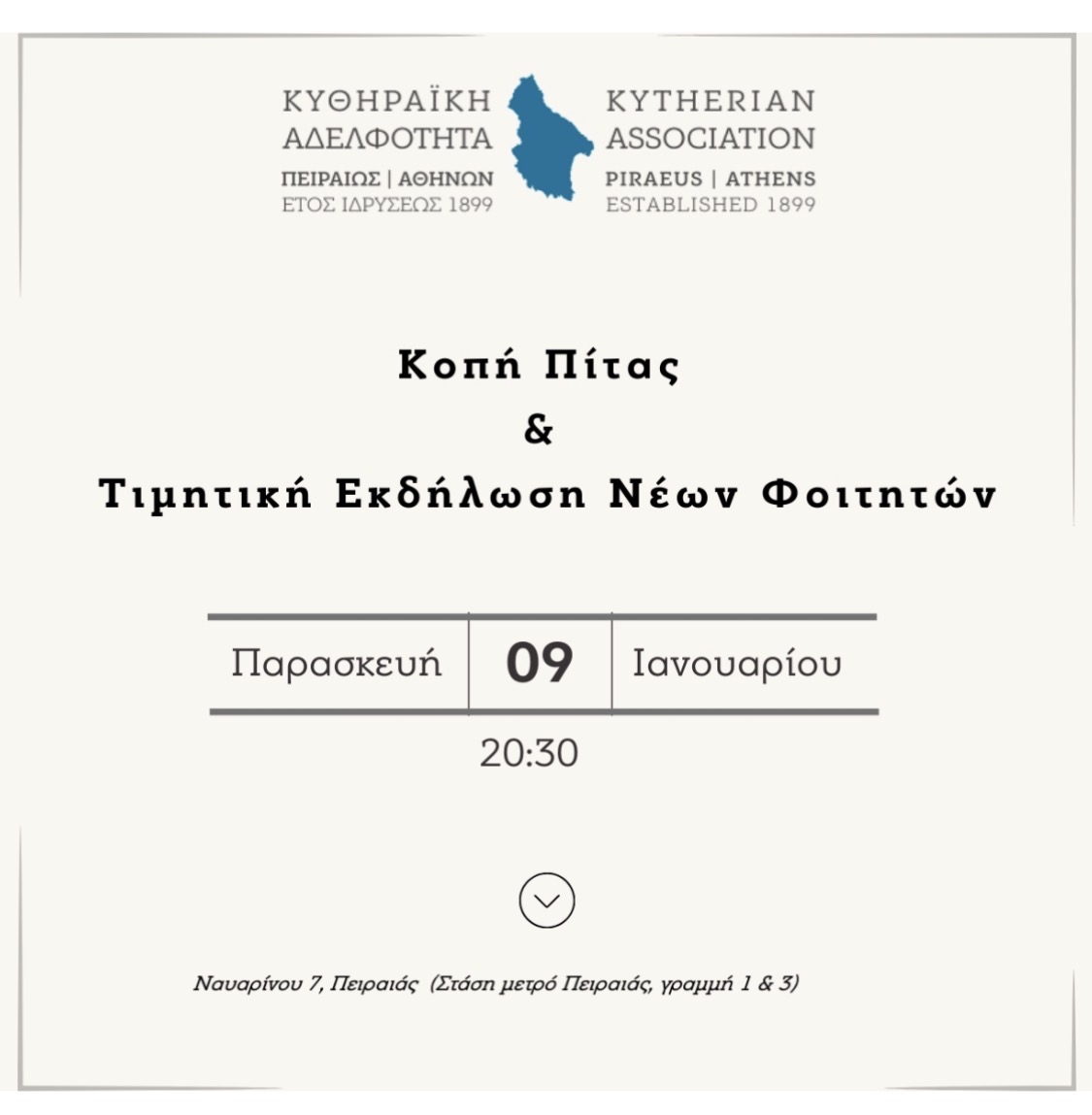 Κυθηραϊκή Αδελφότητα- Πρόσκληση για την κοπή της πίτας καθώς και τη βράβευση των επιτυχόντων