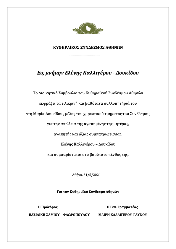 ΚΥΘΗΡΑΪΚΟΣ ΣΥΝΔΕΣΜΟΣ ΑΘΗΝΩΝ – Εις μνήμην Ελένης Καλλιγέρου – Δουκίδου