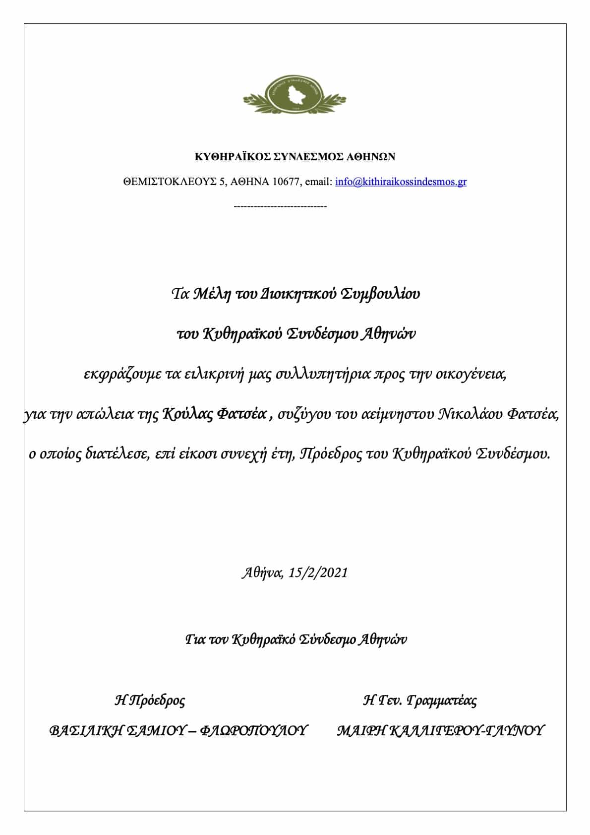 Ανακοινώσεις _ Δελτία Τύπου Κυθηραϊκός Σύνδεσμος Αθηνών για την απώλεια της Κούλας Φατσέα την Φεβ 15, 2021 531