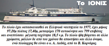 Το ΙΟΝΙΣ. Το πλοίο έχει κατασκευασθεί σε Ελληνικά ναυπηγεία το 1977, έχει μήκος 97.20μ πλάτος 17,40μ, μεταφέρει 170 αυτοκίνητα και 799 επιβάτες και αναπτύσσει μέγιστη ταχύτητα 18,5 ν.μ.
