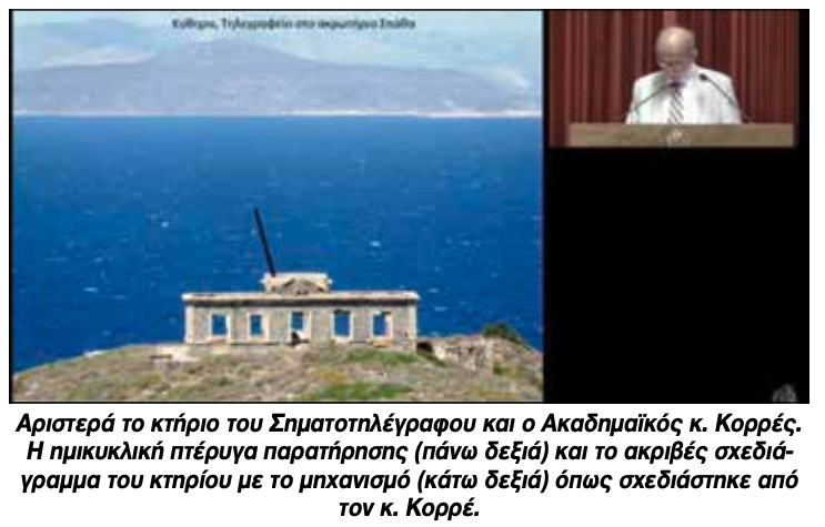 Στις 5 Οκτωβρίου δόθηκε διάλεξη στην Ακαδημία Αθηνών από τον Ακαδημαϊκό κ. Μ. Κορρέ της οποίας περίπου το μισό αναφερόταν στον περίφημο σηματοτηλέγραφο των Κυθήρων ή, όπως ανέφεραν οι Κυθήριοι το σχετικό σταθμό στο Μουδάρι, το «σηματορείο» ή, κατ’ άλλους, Σηματοφορείο. (Όποιος ενδιαφέρεται και έχει τη δυνατότητα μπορεί να παρακολουθήσει τη διάλεξη από την ηλεκτρονική διεύθυνση https://www.youtube.com/watch?v=FCC636buTrY. (Τη διάλεξη μπορείτε να δείτε και στην ηλεκτρονική μας έκδοση στη διεύθυνση: kythiraika.gr αναζητώντας την με το σχετικό τίτλο που αναφέρεται εδώ). Το κομμάτι που ενδιαφέρει τα Κύθηρα είναι από το 43.10’ της διάλεξης.