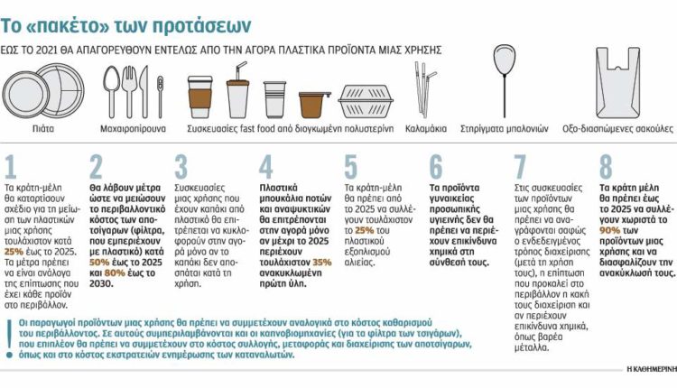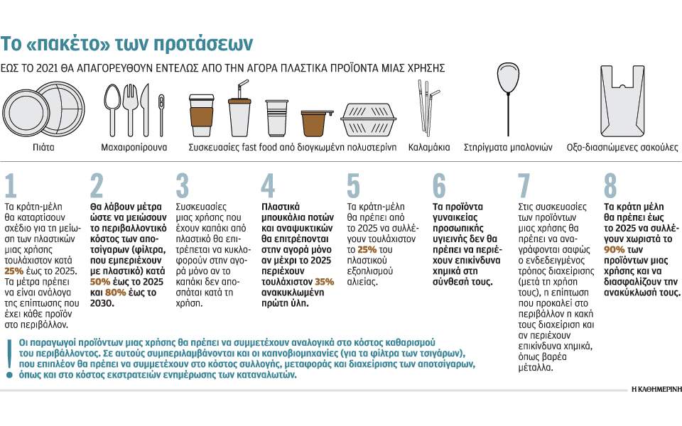 • Εως το 2021 προτείνεται να απαγορευθούν εντελώς από την αγορά πλαστικά προϊόντα μιας χρήσης όπως μαχαιροπίρουνα, πιάτα, καλαμάκια, στηρίγματα μπαλονιών, μπατονέτες, οξοδιασπώμενες σακούλες και συσκευασίες fast food από διογκωμένη πολυστερίνη.