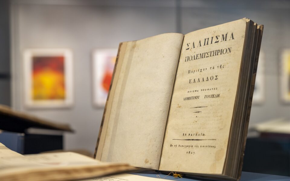 Πράγματι, σε μία από τις προθήκες μπορεί να δει κανείς ένα μικρό αφιέρωμα στο σπουδαίο, αν και ανολοκλήρωτο, ποίημα του Σολωμού, με χαρακτικά του Μανώλη Χάρου και δύο μόνο ανθολογημένους στίχους: «…γιατί άκουσα τα μάτια της μέσα στα σωθικά μου» και «…σε γκρεμό κρέμουμαι βαθύ, κι αυτό βαστώ μονάχο». Στην ακριβώς απέναντι κόγχη εκτίθενται πρώτες εκδόσεις που πλαισιώνουν ένα αποσπασματικό χειρόγραφο του «Διαλόγου» του Διονυσίου Σολωμού. Μέσα από τα ορνιθοσκαλίσματα του ποιητή, αναδύεται το νεανικό έργο που αποτελεί και τον βασικό άξονα της έκθεσης. «Την εποχή που γράφεται ο “Διάλογος” η έννοια του ελληνικού έθνους υπάρχει μόνο μέσα από τη γλώσσα. Αυτή, ως έκφραση συναισθηματικού πλούτου, συνενώνει και ταυτίζει –δίνει δηλαδή ταυτότητα– τους ανθρώπους αυτού του τόπου· αυτή την αλήθεια καταφέρνει να συλλάβει ο Σολωμός», παρατηρεί ο Μανώλης Χάρος, ο οποίος άντλησε τα τελευταία χρόνια έμπνευση από τους «επαναστάτες», όπως χαρακτηρίζει τους ρομαντικούς ποιητές της εποχής.