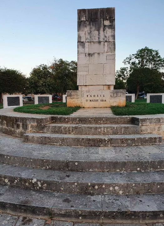 Στο κέντρο του μνημείου, πάνω σε ένα μεγάλο κυκλικό βάθρο, δεσπόζει μία μαρμάρινη στήλη, ύψους περίπου δύο μέτρων, που στην πρόσοψη της αναφέρει «ΕΝΩΣΙΣ 21 ΜΑΪΟΥ 1864».