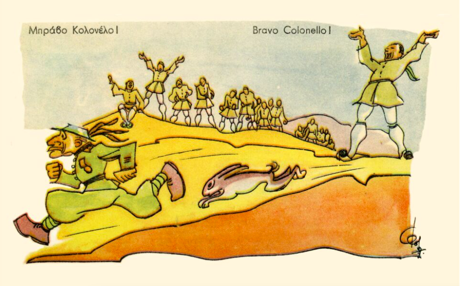 Η πολεμική γελοιογραφία θα γνωρίσει στιγμές δόξας παρασυρμένη από το Επος του Αλβανικού Μετώπου. Το πανηγυρικό κλίμα έληξε με την έναρξη της Κατοχής. Για τέσσερα χρόνια οι γελοιογράφοι κράτησαν τα έργα τους ερμητικά κλειστά στα συρτάρια τους, ελπίζοντας να μπορέσουν, κάποια στιγμή, να τα δημοσιεύσουν. Οπως ο Σταμάτης Πολενάκης, που στην πλάτη ενός μπουφέ στο πατρικό του σπίτι στη Σίφνο, κάτω από τη μύτη των κατακτητών, «κεντούσε» με το πενάκι του τα παθήματα του Μουσολίνι: «Φυσικά είχα λάβει τα μέτρα μου. Είχα έτοιμη κρυψώνα που σε τρία δευτερόλεπτα ήταν κρυμμένο το σχέδιο που έφτιαχνα. Οσο για τα σύνεργα της σχεδίασης, είχα πλάι μου ένα ημιτελές, αθώο τοπίο»!