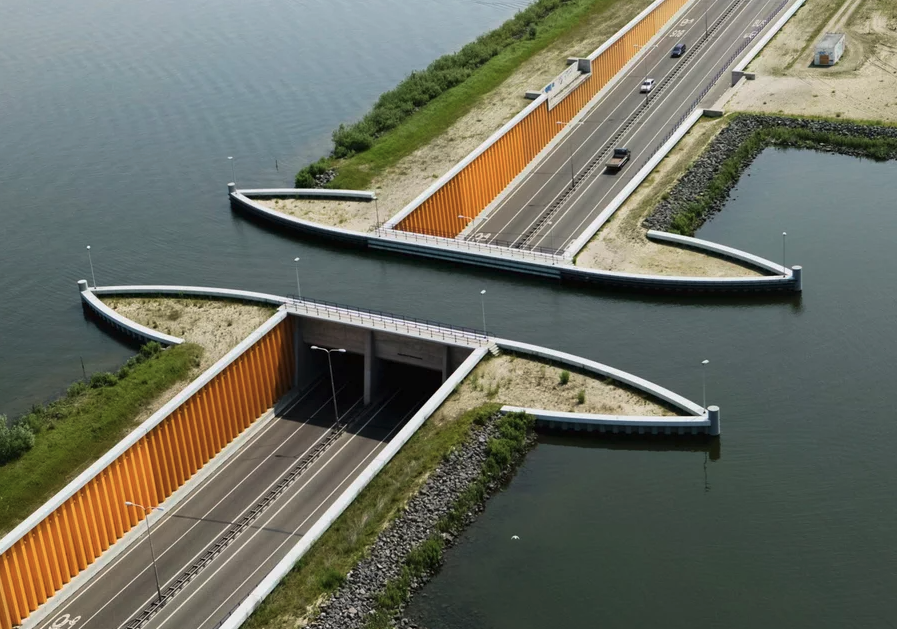 Το κανάλι Veluwemeer στην πόλη Harderwijk επιτρέπει στα σκάφη να πλεύσουν πάνω από τη γέφυρα, ενώ τα αυτοκίνητα τρέχουν από κάτω τους. Η αξιοσημείωτη κατασκευή άνοιξε το 2002 και συνέδεσε την ηπειρωτική χώρα της Ολλανδίας με το Flevoland, το μεγαλύτερο τεχνητό νησί στον κόσμο. Το έργο έχει μήκος 25 μέτρα και πλάτος 19, με τη γέφυρα να βρίσκεται 3 μέτρα κάτω από την επιφάνεια του νερού.