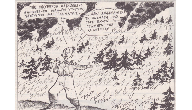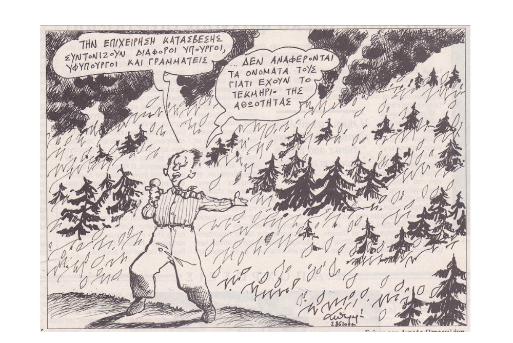 Ένας καμένος κέδρος από τη μεγάλη φωτιά στα Μυρτίδια το 2000 για την οποία δεν βρέθηκε κανένας υπεύθυνος, ούτε και ελήφθη από τότε κανένα μέτρο προστασίας της περιοχής, με τα γνωστά σήμερα καταστροφικά αποτελέσματα. Ο φίλος και συνεργάτης Γ.Π.Δρυμωνιάτης είχε γράψει ένα εξαίσιο ποίημα για τον χαμένο κέδρο στο πατρικό του της εξοχής, το οποίο θυμηθήκαμε τώρα, που ξανακάηκε όλη η περιοχή και το σημείο που ήταν ο περίφημος κέδρος. Προφητικός ο λόγος από μία πένα που έχει ζυγίσει τα πάντα. Παράλληλα βρήκαμε και μία γελοιογραφία της εποχής (του Α. Πετρουλάκη από την ΚΑΘΗΜΕΡΙΝΗ) με ένα μήνυμα που ταιριάζει γάντι σε όσα ζήσαμε στην πυρκαγιά του περασμένου Αυγούστου. Απλά για να μην ξεχνάμε!