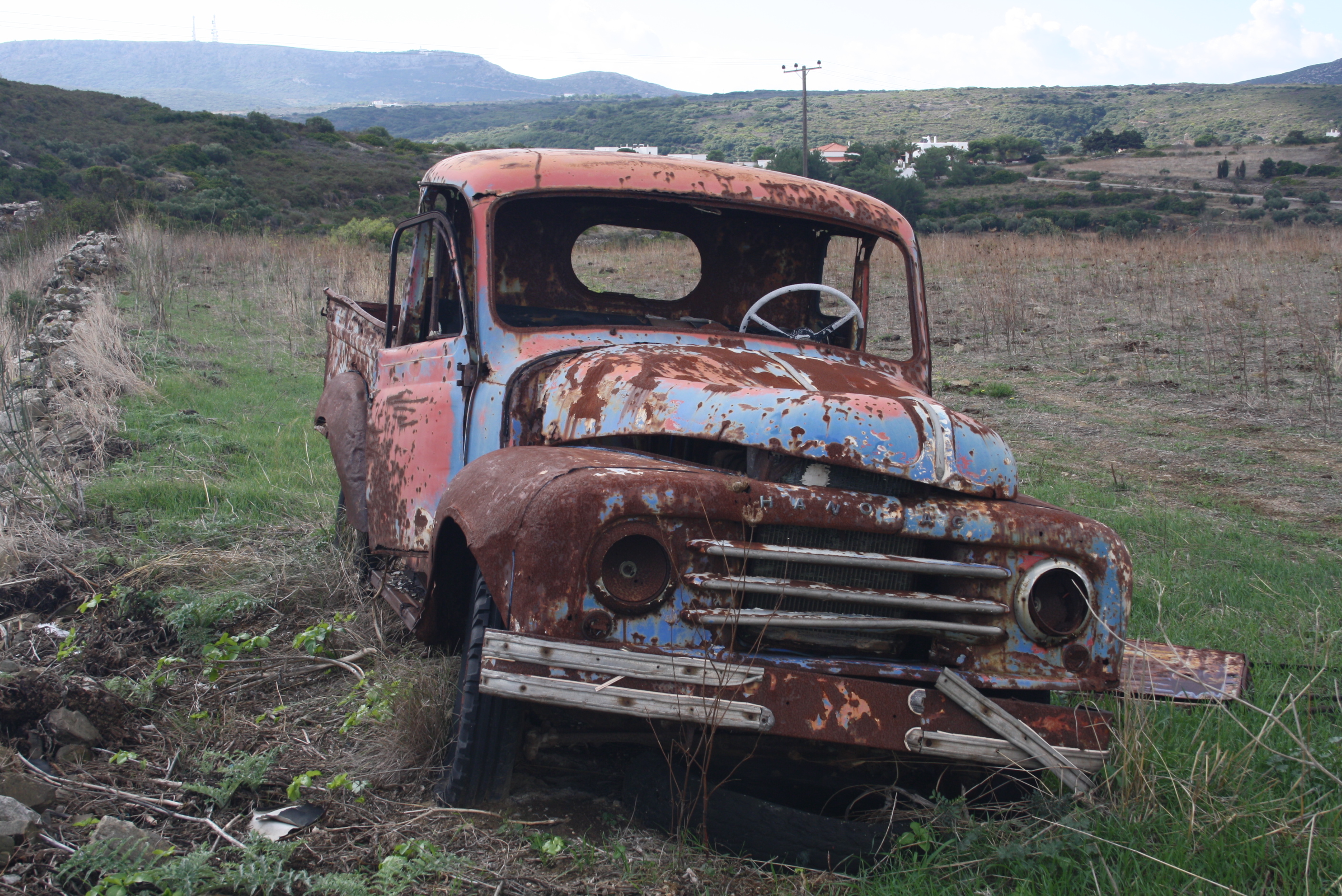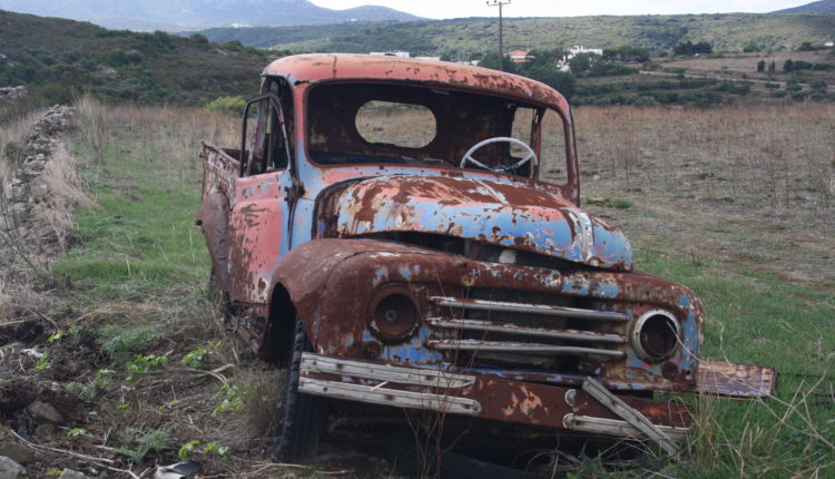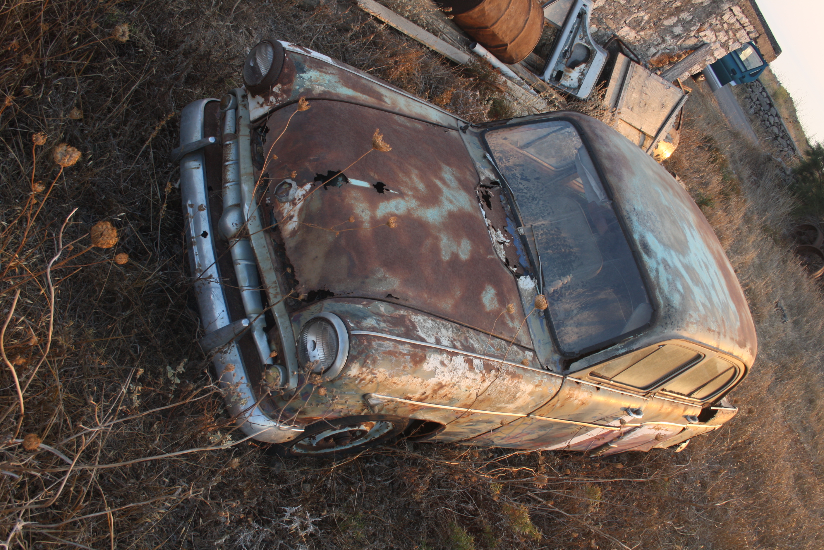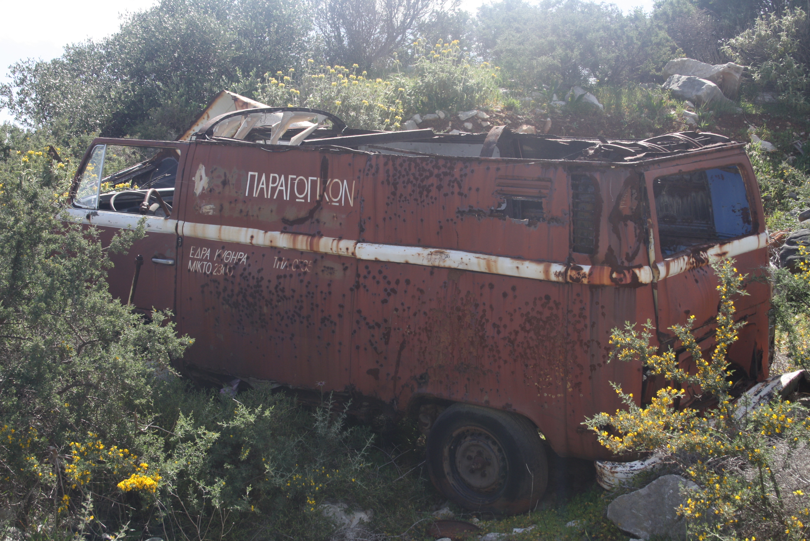 6. Ένα από τα πλέον επιτυχημένα αυτοκίνητα στο είδος του. Μία «κλούβα» της Φολκσβάγκεν (VW) σκουριάζει σε ένα χωματόδρομο στη Χαμηλή εκεί που την άφησαν προσωρινά και σιγά-σιγά έγινε το νεκροταφείο της, αφού φύτρωσαν μέχρι και ασπάλαθοι στη μηχανή της.