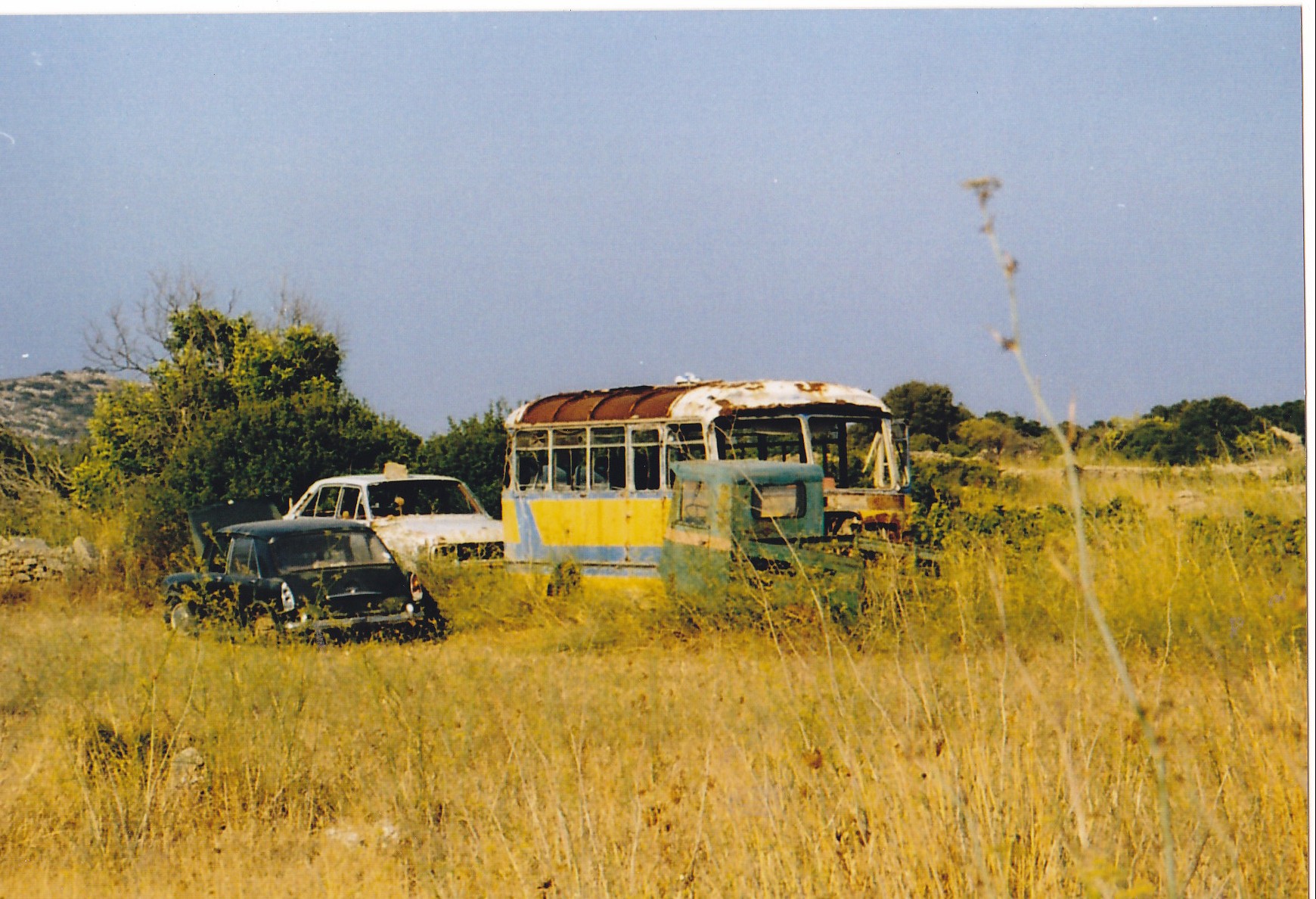 5. Ένα από τα λεωφορεία του Νικ. Καρύδη από το Μυλοπόταμο. Μετέφερε μαθητές τη δεκαετία του 1960 και τώρα σκουριάζει σε ένα χωράφι στο Μυλοπόταμο μαζί με μερικά ερείπια των Κυθηραϊκών δρόμων. Η φωτογραφία είναι από το 2003.