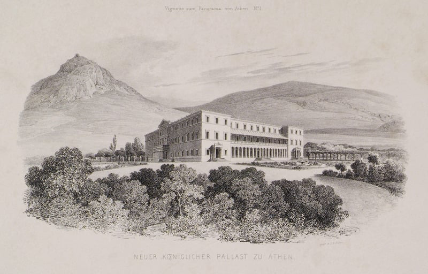 Το βασιλικό παλάτι της Αθήνας. Βινιέτα αφιερωμένη στην Α.Μ. τον βασιλιά Οθωνα της Ελλάδος – από την έκδοση του August Ferdinand Stademann «Panorama von Athen», 1841 (Ελληνική Βιβλιοθήκη – Κοινωφελές Ιδρυμα Αλέξανδρος Σ. Ωνάσης, el.travelogues.gr)
