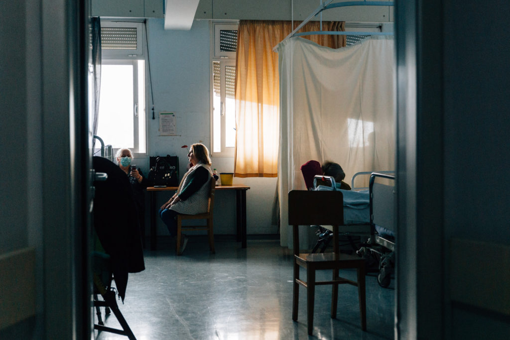 Σκυμμένα πρόσωπα, συγγενείς που καπνίζουν στο προαύλιο, γκρίζα δωμάτια, λευκοί διάδρομοι, σκουρόχρωμες κουρτίνες και το υγειονομικό προσωπικό σε φρενήρεις ρυθμούς για να καλύψει τις ανάγκες. Οι νύχτες, όμως, είναι ακόμα πιο αντίξοες.