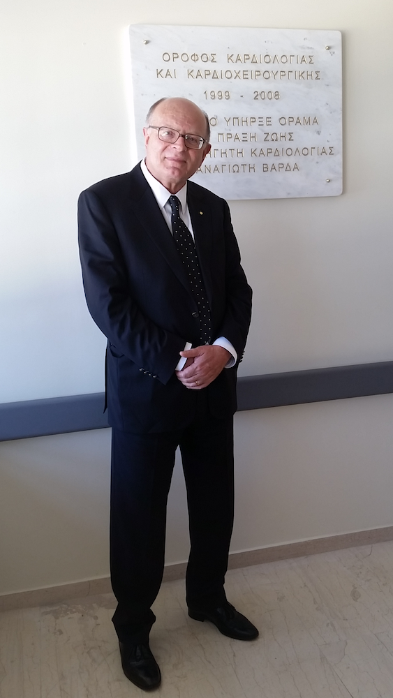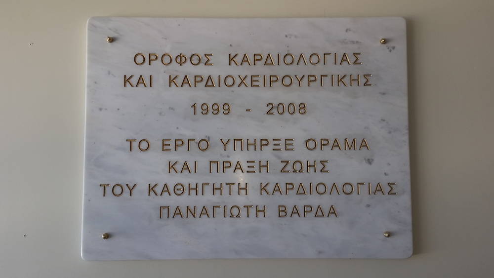 Περίπου τρία χρόνια πριν, στον 4ο όροφο της Καρδιολογικής Κλινικής του Πανεπιστημιακού νοσοκομείου Κρήτης είχε γίνει μία σεμνή τελετή στην οποία είχε αποκαλυφθεί μία πλάκα προς τιμήν του εμπνευστή και ουσιαστικού δημιουργού του ορόφου αυτού, που επέτρεψε την πραγματοποίηση καρδιοχειρουργικών επεμβάσεων στην Κρήτη, του συμπατριώτη μας και διαπρεπούς καρδιολόγου κ. Π. Βάρδα.