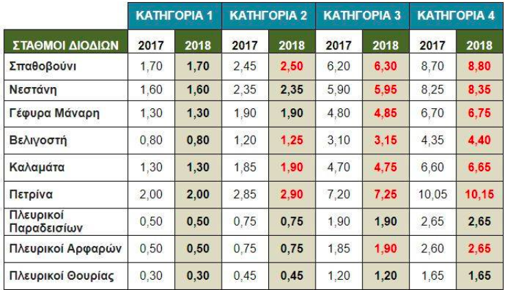 Ο νέος τιμοκατάλογος ισχύει από τα μεσάνυχτα της Κυριακής 7 Ιανουαρίου 2018 προς Δευτέρα 8 Ιανουαρίου 2018.