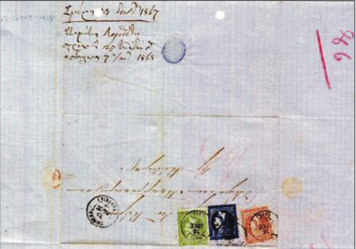 Φιλοτελικά η επιτολή φέρει μια σφραγίδα τύπου Ι και τρία γραμματόσημα Μεγάλης Κεφαλής Ερμού, των 40, 20 & 5 λεπτών με ημερομηνία αποστολής από τη Σμύρνη, στις 23.12.1867. Η επιστολή φέρει σφραγίδα άφιξης Κυθήρων στις 26. 12.1867 (δηλαδή εντός 4 ημερών) και μια χειρόγραφη σημείωση ότι ο αποδέκτης την πήρε στα χέρια του στις 25. 12 (ανήμερα δηλαδή των Χριστουγέννων). Τα τέλη καταβλήθηκαν από τον παραλήπτη.