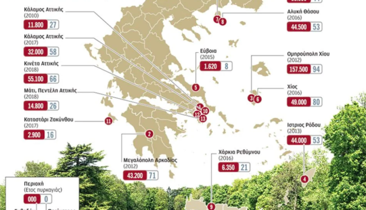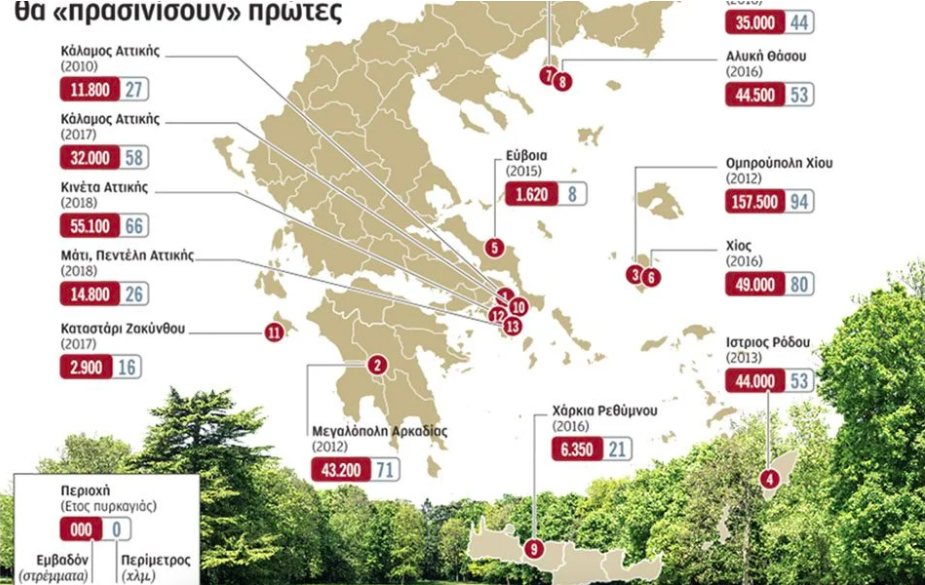 Πού βρίσκονται οι περιοχές που έχουν προεπιλεγεί; Η μεγαλύτερη έκταση (157.000 στρέμματα) βρίσκεται στην Ομηρούπολη της Χίου και είχε καεί το 2012 (στο νησί επελέγησαν και ακόμη 49.000 στρέμματα που κάηκαν το 2016). Ακολουθεί έκταση 55.100 στρεμμάτων στην Κινέτα και 14.800 στρεμμάτων στο Μάτι που κάηκαν το 2018 (στην Αττική έχουν επιλεγεί ακόμα 11.800 στρέμματα στον Κάλαμο, που κάηκαν το 2010). Επίσης επελέγησαν 43.200 στρέμματα στη Μεγαλόπολη Αρκαδίας (κάηκαν το 2012), 44.000 στρέμματα στη Ρόδο (κάηκαν το 2013), 35.000 στρέμματα και 44.500 στρέμματα στον Πρίνο και στην Αλυκή Θάσου και μικρότερες εκτάσεις στην Εύβοια, στο Ρέθυμνο και στη Ζάκυνθο.
