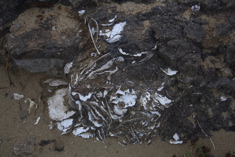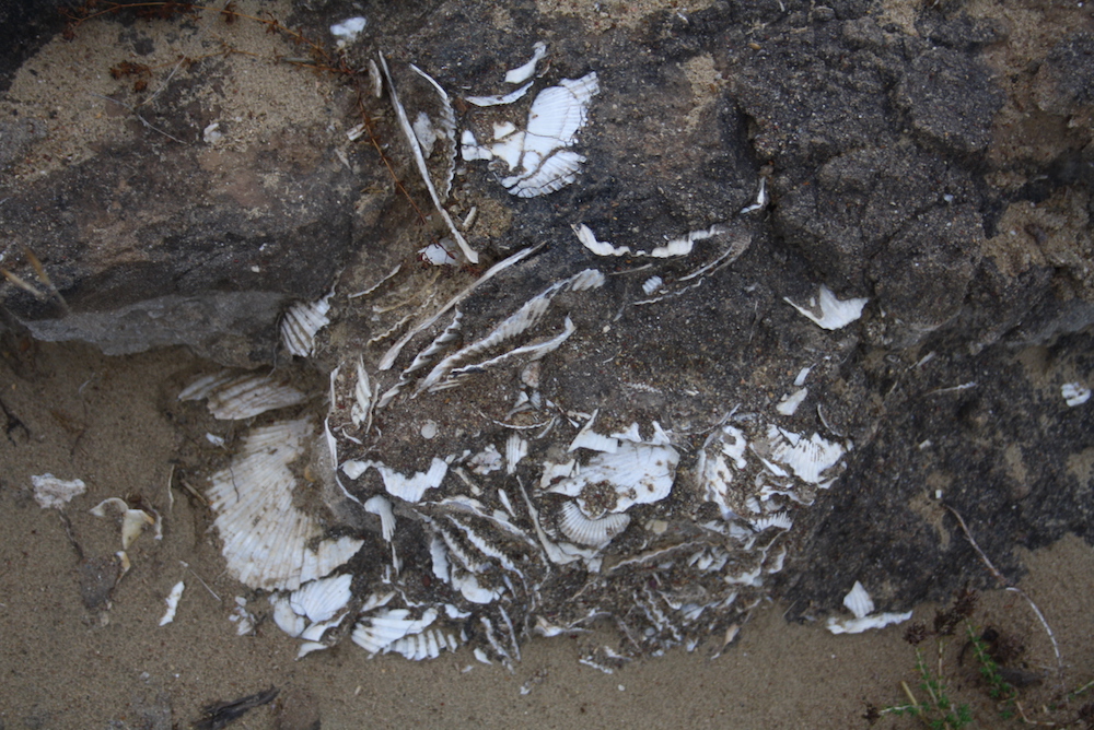 Λίγο έξω από τα Μητάτα, λοιπόν, ξεκινώντας από το τέλος του ανατολικού δρόμου που οδηγούν προς αυτά από την είσοδο που βρίσκεται προς τα Φριλιγγιάνικα και παίρνοντας έναν, σχεδόν παράλληλο, βατό χωματόδρομο, αφού περάσουμε από τα λείψανα μερικών παλιών ναών, που έχουν καταστραφεί από το χρόνο και την αδιαφορία, οδηγούμεθα σε μία ήμερη και ομαλή περιοχή στην οποία τα ίχνη της αρχέγονης θάλασσας είναι ορατά από παντού. Σε κάθε βήμα συναντά κανείς εκατοντάδες συσσωματώσεις οστράκων, πιθανόν θανατοκοινωνίες, από γνωστά και συνηθισμένα είδη, τα οποία σήμερα ονομάζουμε πεταλίδες και που αποτελούν έναν ξεχωριστό μεζέ για όποιον τις εντοπίζει το καλοκαίρι στις θαλασσινές εξορμήσεις του. Φυσικά οι ειδικοί επιστήμονες αναφέρουν όλα αυτά τα όστρακα με τις επιστημονικές τους ονομασίες, τις οποίες παρακάμπτουμε, καθώς θα σας κουράσουμε με την παράθεση σειράς λατινικών ονομάτων, όπως: flexuosa, latissima,zenonis, ostrea lamellose, pectin benedictus, pecten reghiensis, C.scabrella, C. hyaline Iκαι πολλά άλλα. Μόνο ένα θα ήταν ενδιαφέρον να θυμόσαστε: Pecten jacobeus το λεγόμενο και «κτένι της Αφροδίτης».